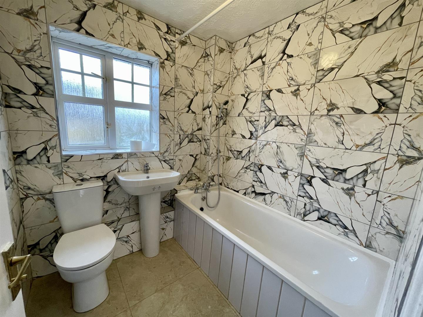 Panel enclosed bath with mixer tap and shower head attachment, pedestal wash handbasin with chrome mixer tap, WC, radiator, tiled walls, vinyl tiled flooring, shaver point, extractor fan, double glazed window to front aspect