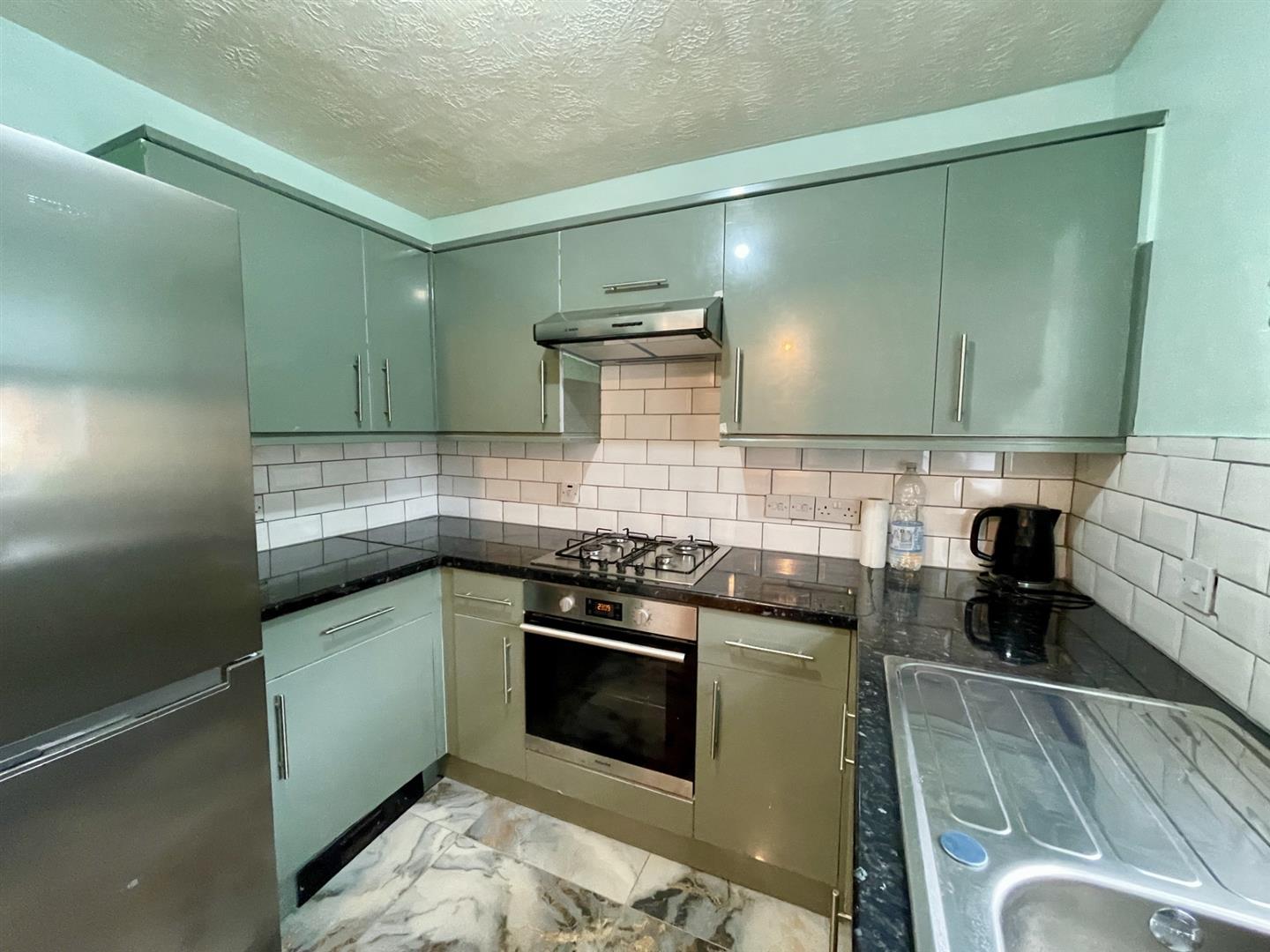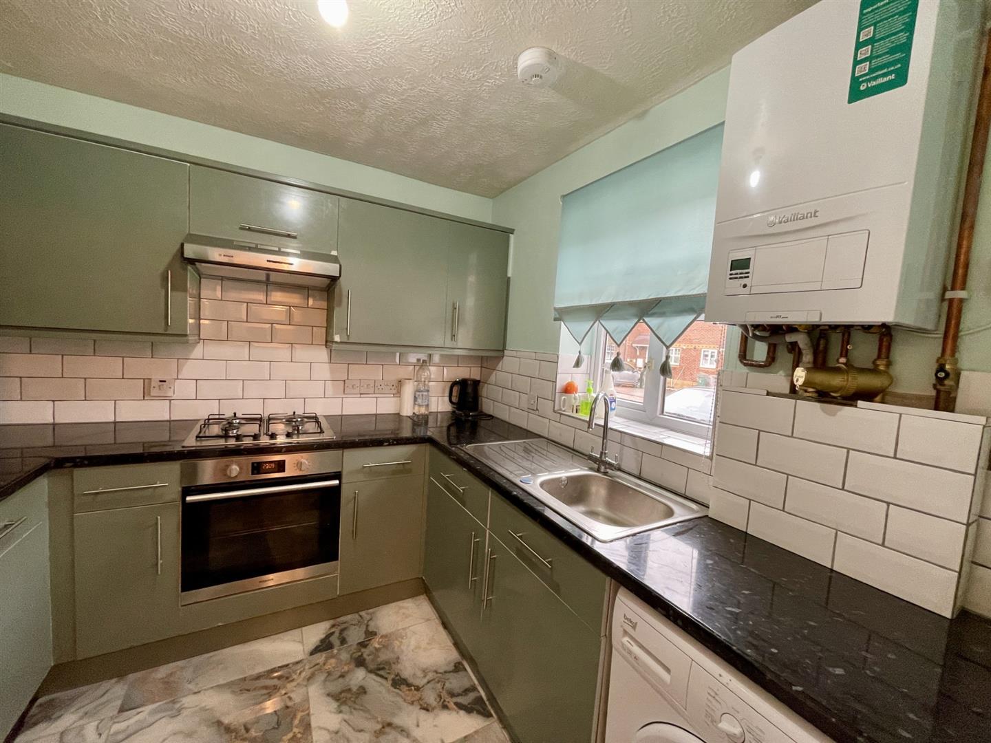 Range of fitted kitchen units and drawers, laminate worksurface, inset stainless steel sink with chrome mixer tap, integrated oven, gas hob and extractor fan above, wall mounted Vaillant boiler, fridge freezer and washing machine, tiled splashback, vinyl flooring, double glazed window to front aspect.