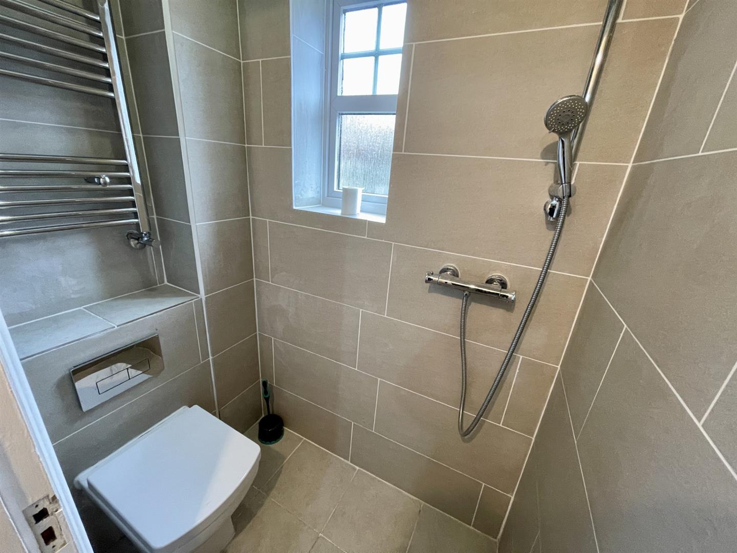 Enclosed WC, thermostatic shower, heated chrome towel rail, tiled walls and flooring, extractor fan, double glazed window to side aspect