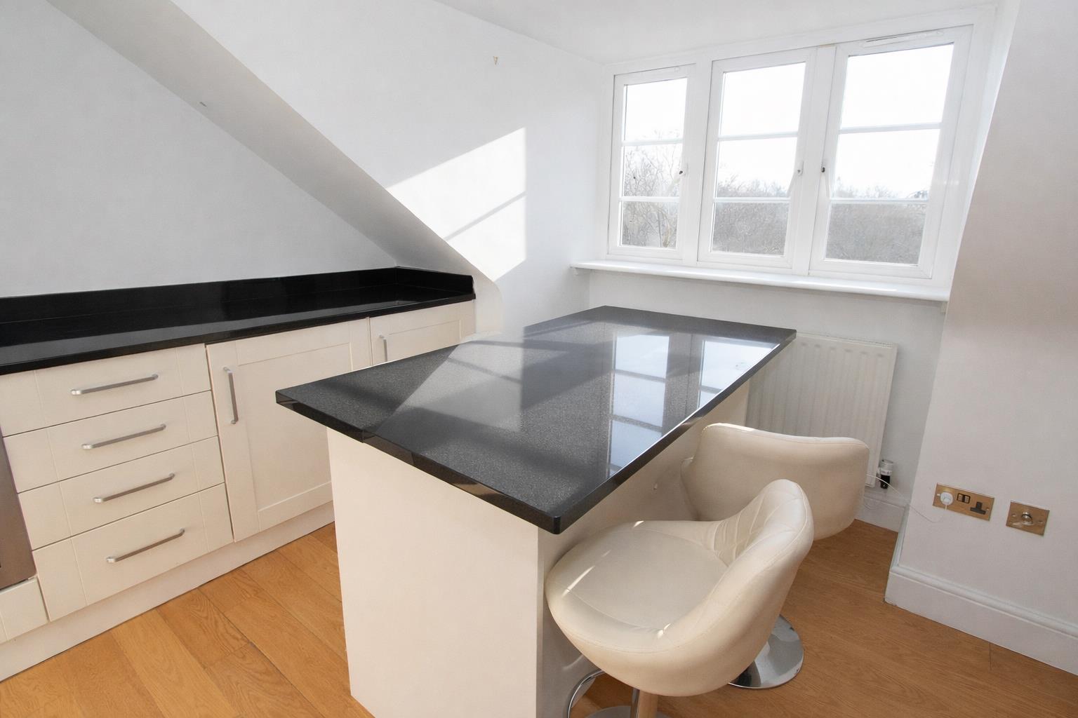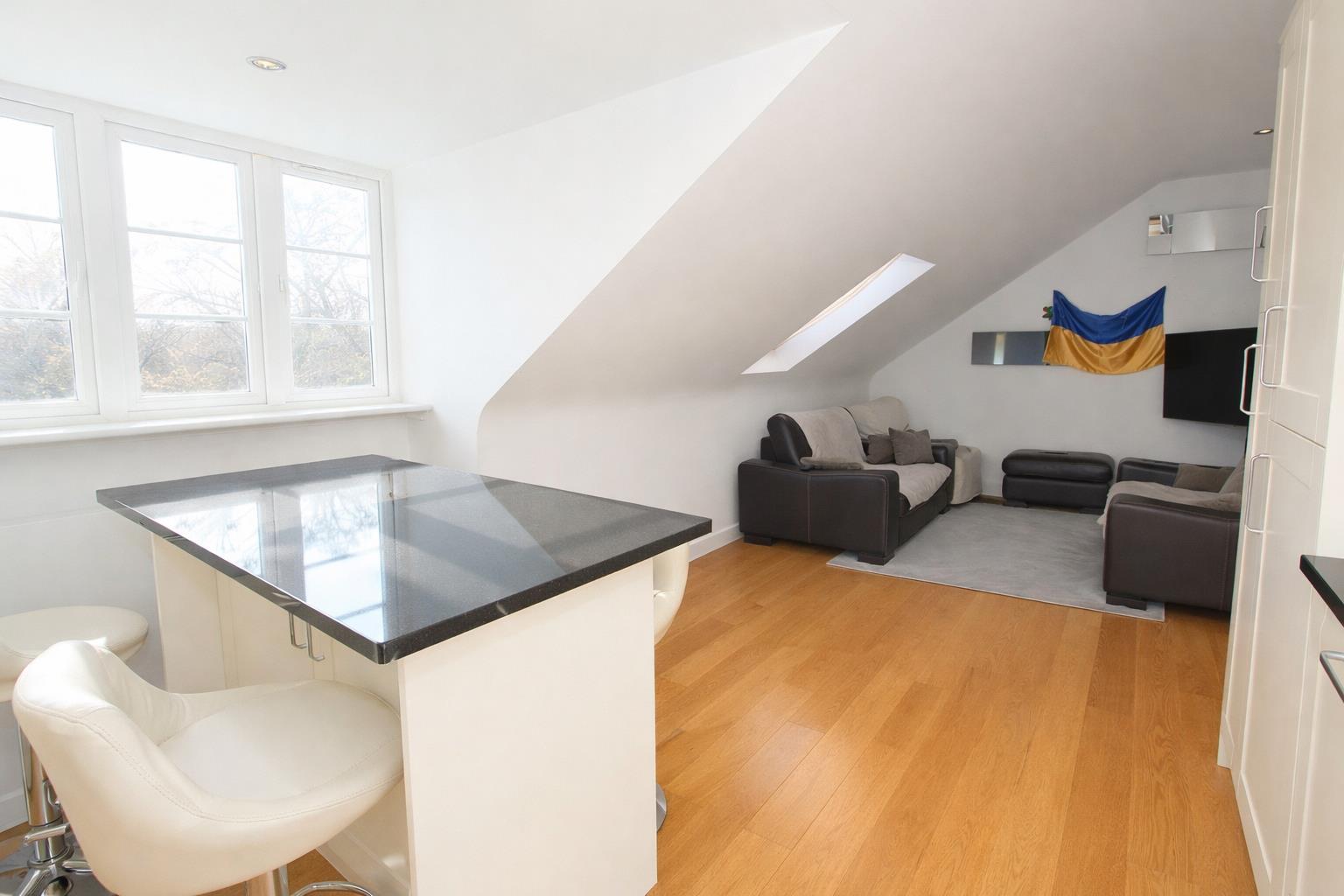 Laminate wood flooring throughout, Velux window, kitchen has a range of fitted wall units with matching cupboards and drawers below, granite work surfaces, inlaid stainless steel sink and chrome mixer tap, oven with gas hob and extractor fan above, breakfast bar with granite work surfaces, UPVC double glazed window, radiator