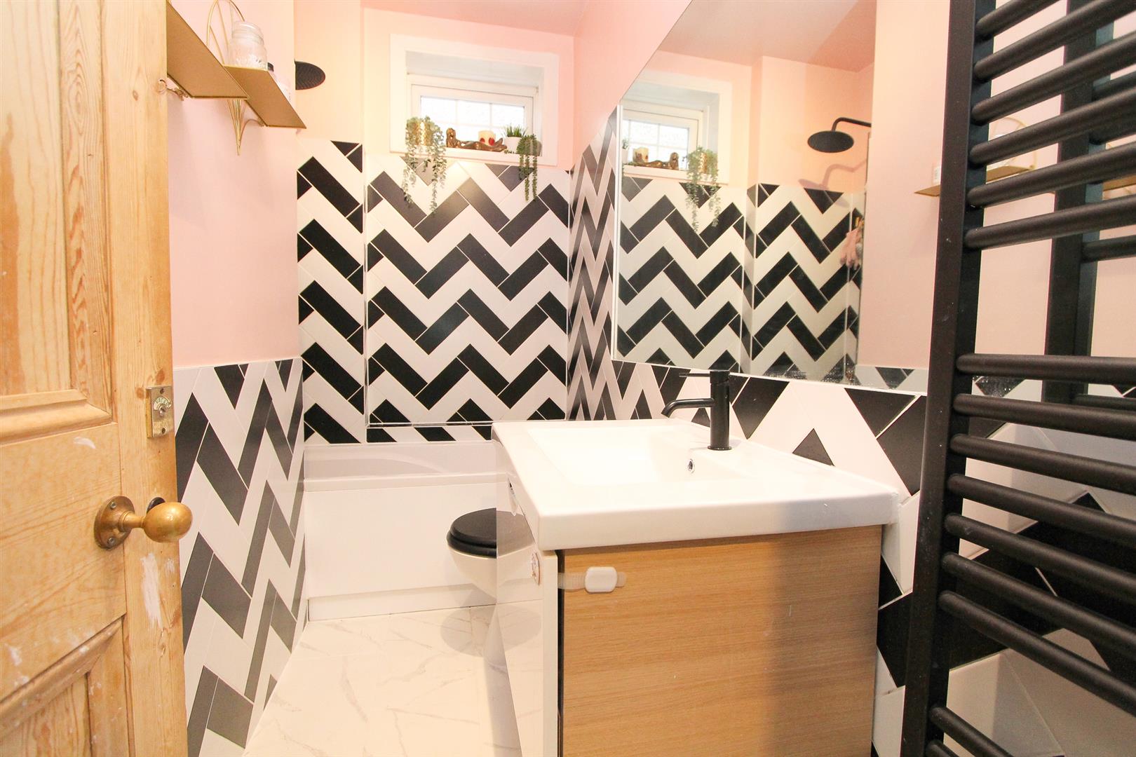 Modern three piece suite comprising panel enclosed bath with mixer tap and shower above, wash hand basin with mixer tap and storage cupboard below, low level push button flush WC, heated towel rail, extractor fan, tiled flooring, tiled walls.