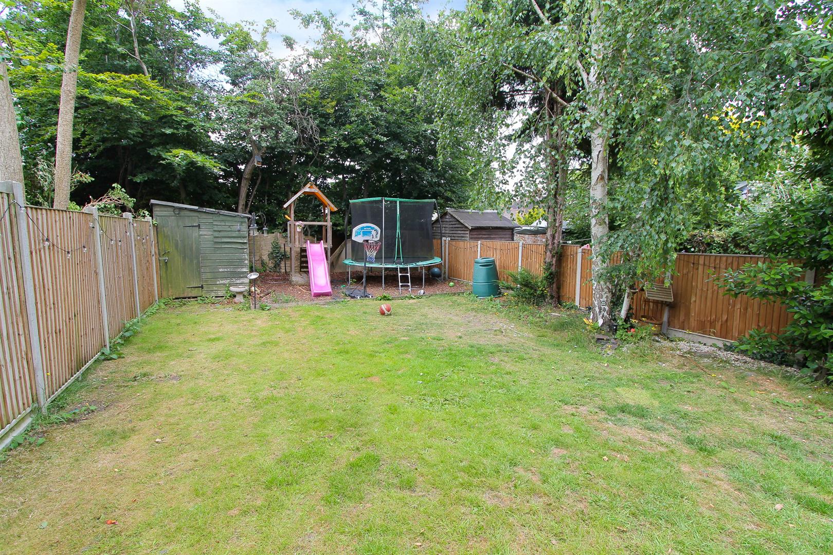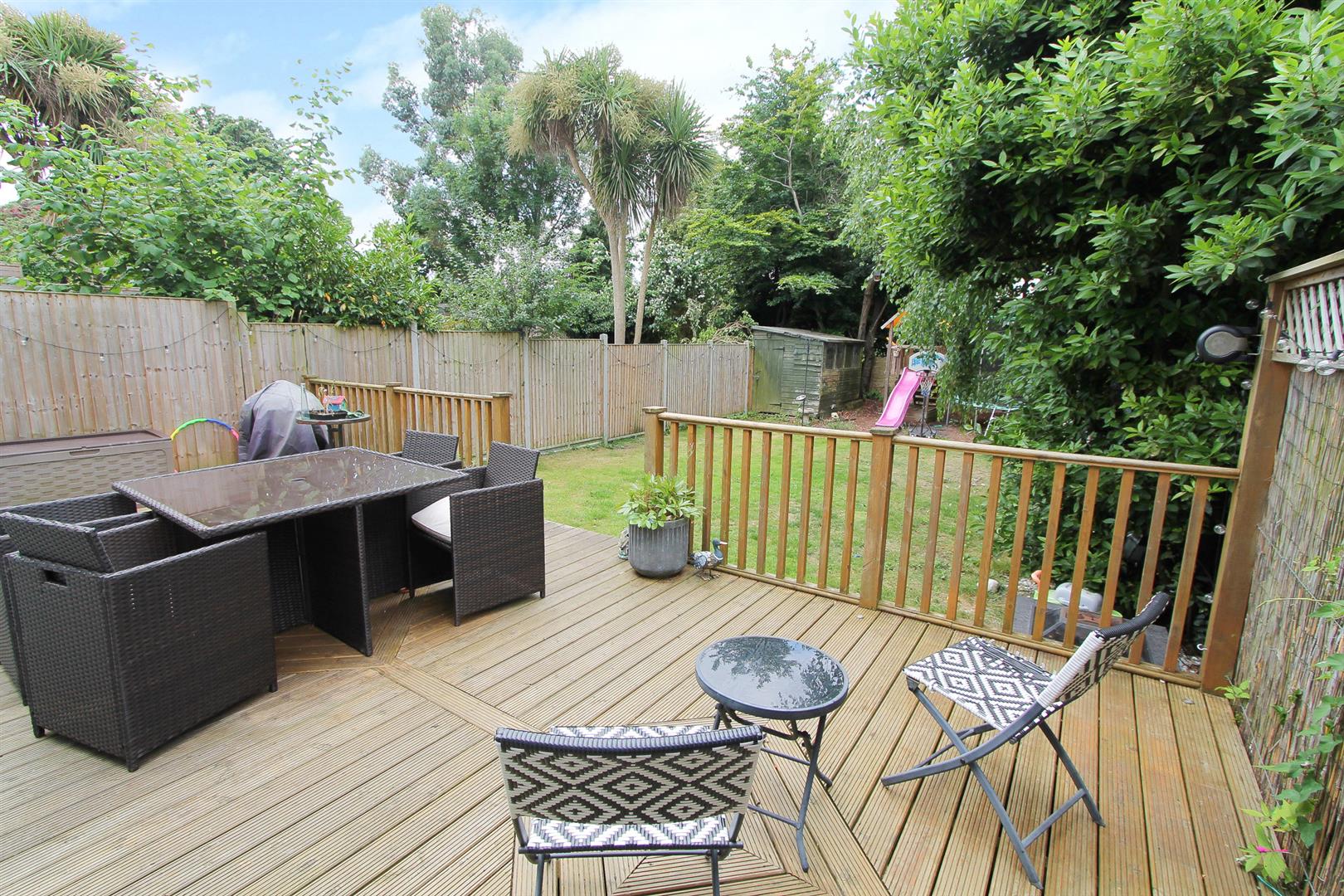 Large decking area, leading to lawn section with flower beds bordering, garden shed, fence enclosed, side access, power and water supply.