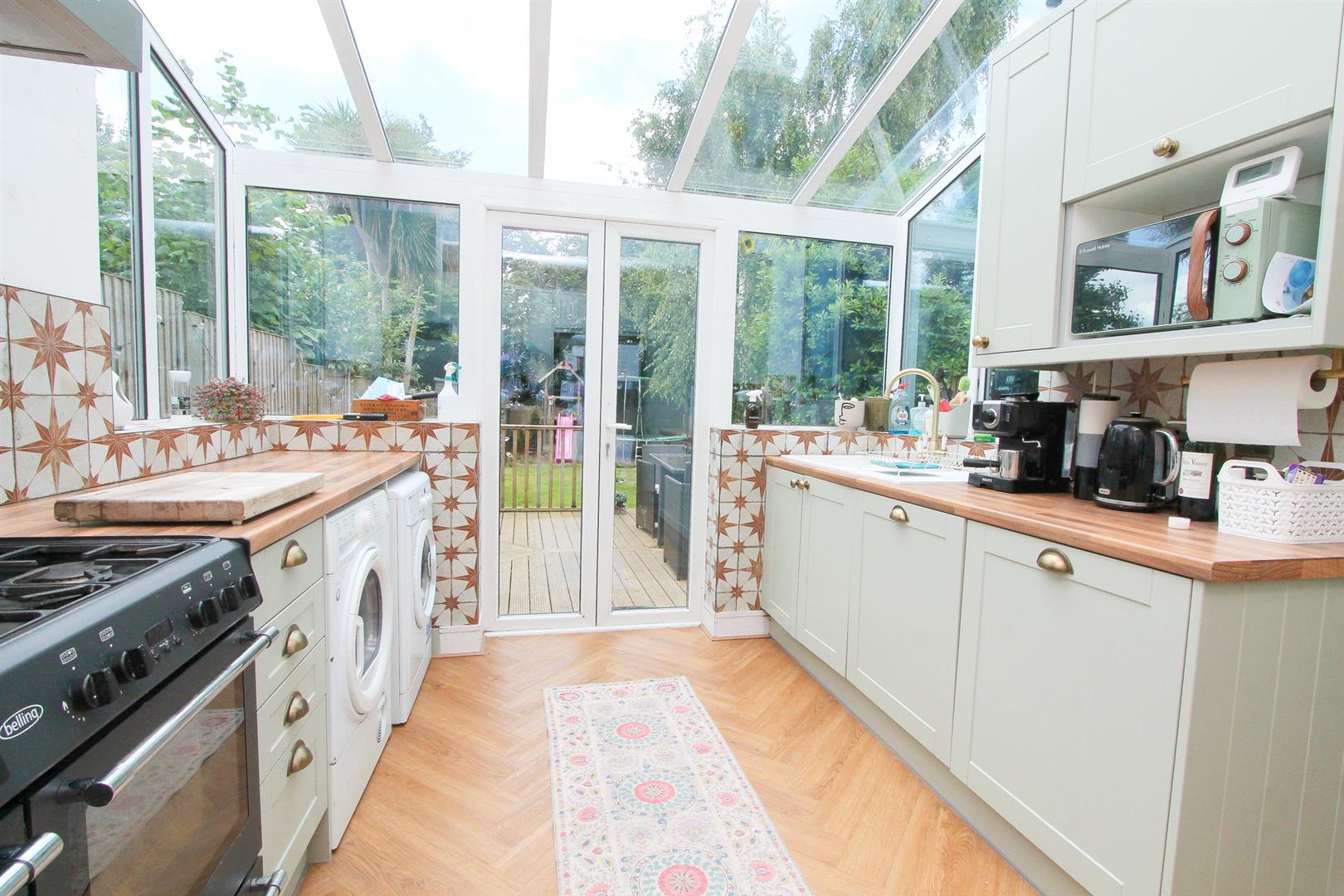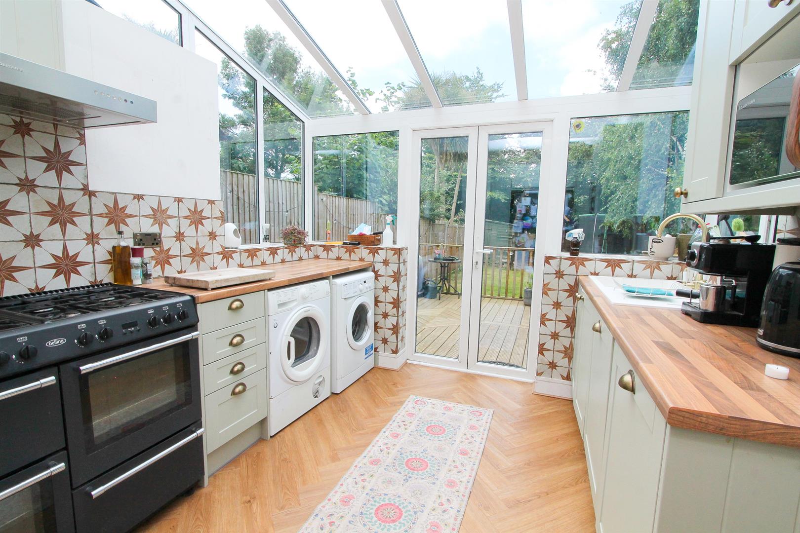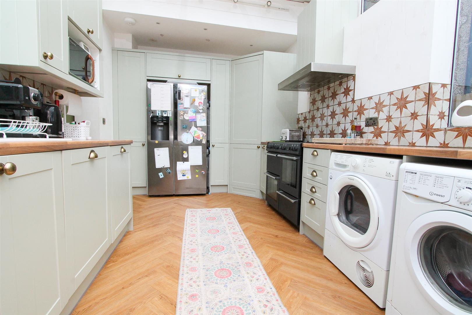 Range of fitted wall units with matching drawers and doors below, roll top work surfaces with inlaid sink and mixer tap, large gas range cooker with extractor fan above, integrated dishwasher, space and plumbing for washing machine and tumble dryer, space for tall standing fridge freezer, larger cupboard, herringbone vintage oak flooring with underfloor heating, UPVC double glazed windows to side and rear aspects with doors leading to rear garden.
