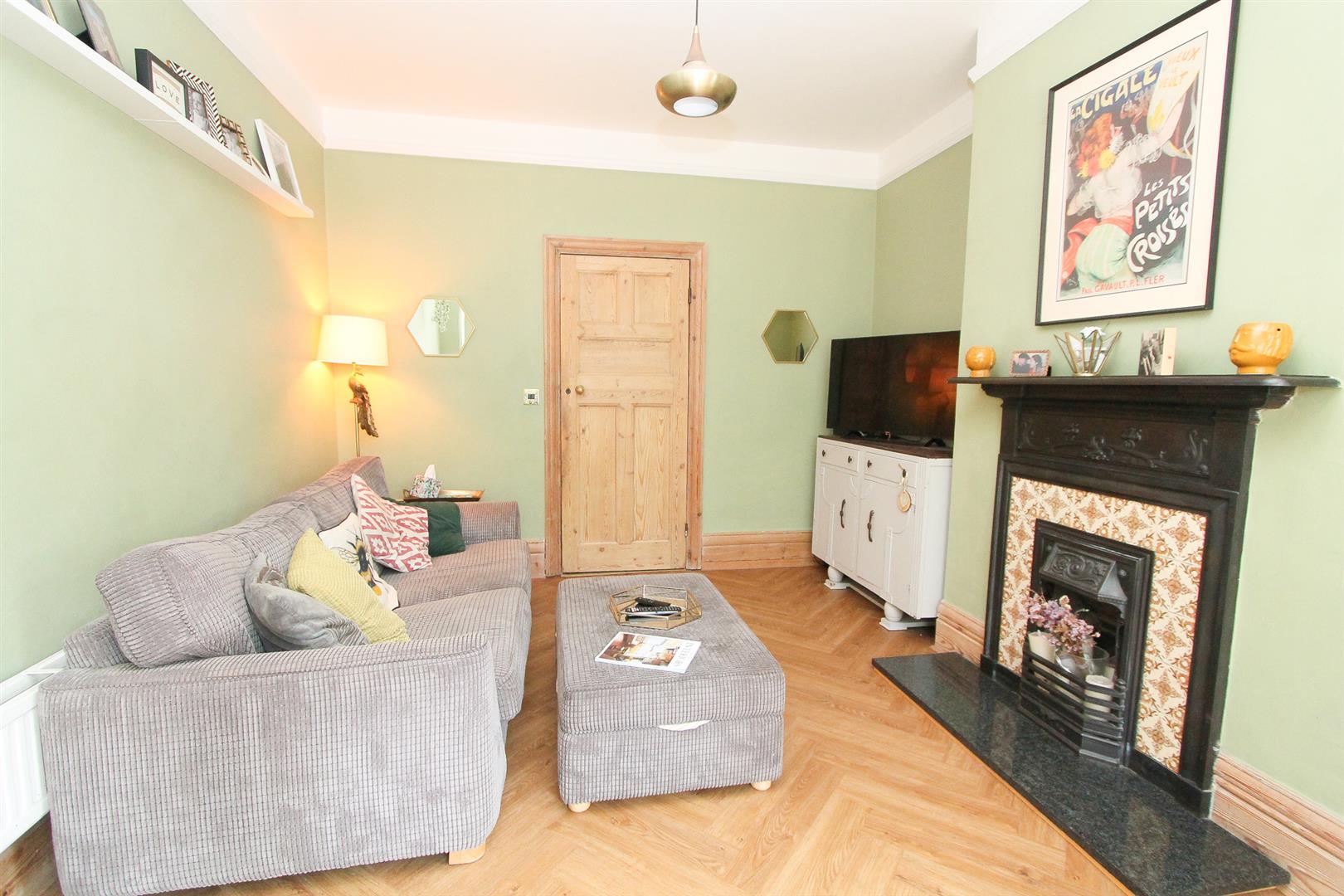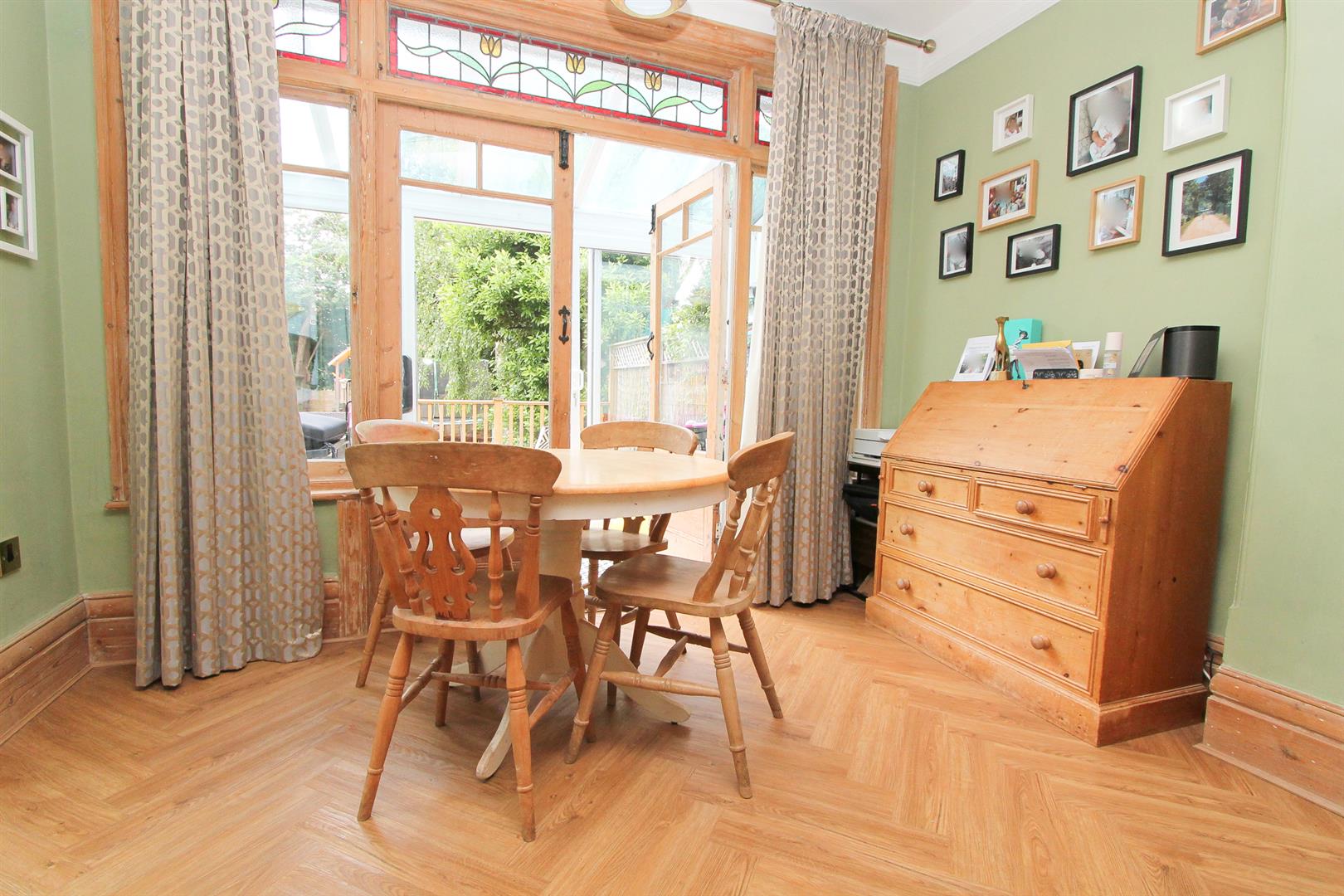 Stained glass windows and double doors to rear aspect directly onto sun room, feature cast iron fireplace, picture rail, double panelled radiator, herringbone vintage oak flooring.