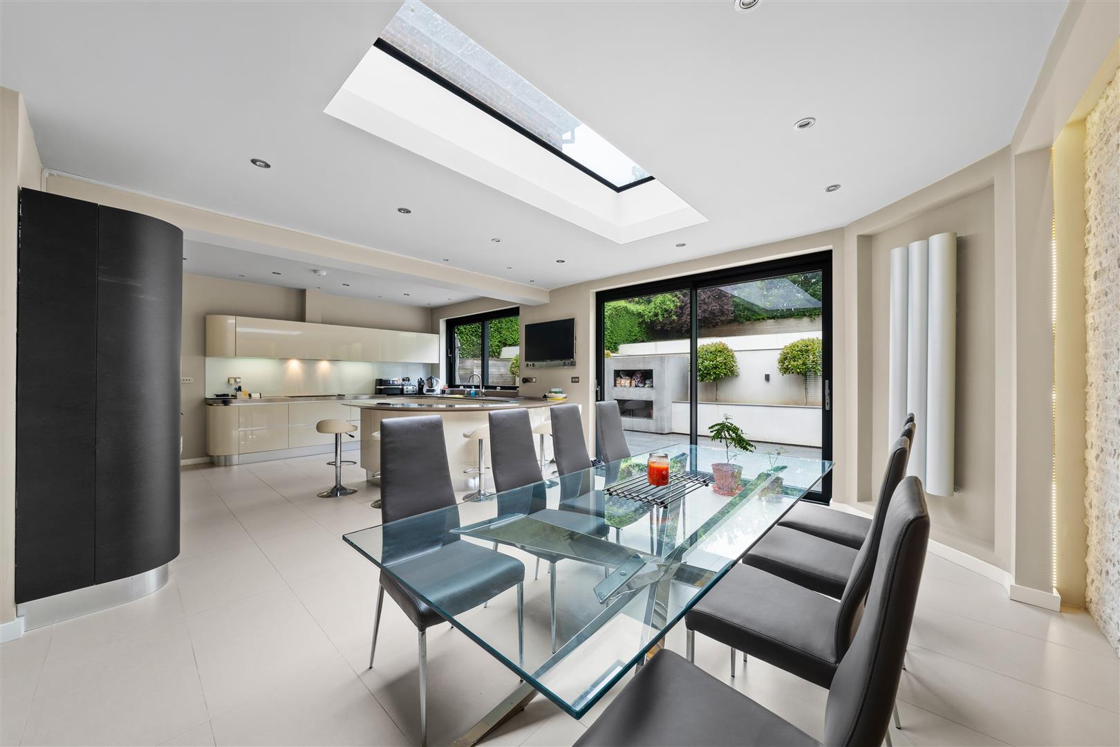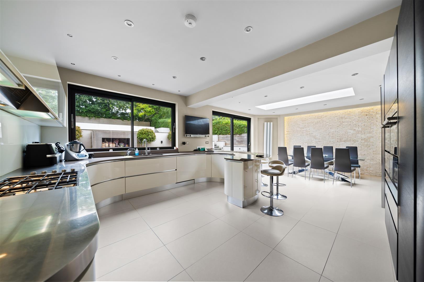 Range of luxury modern fitted kitchen units and drawers, Quartz worktops, integrated 'Siemens' microwave, steamer, and two ovens, integrated full length fridge and freezer, integrated 'Siemens' dishwasher, integrated gas hob with extractor fan above, inset double bowl stainless steel sink with chrome mixer tap, 'Quooker' tap, breakfast bar, tiled flooring, modern radiator, double glazed window and sliding doors leading out to garden, large skylight.