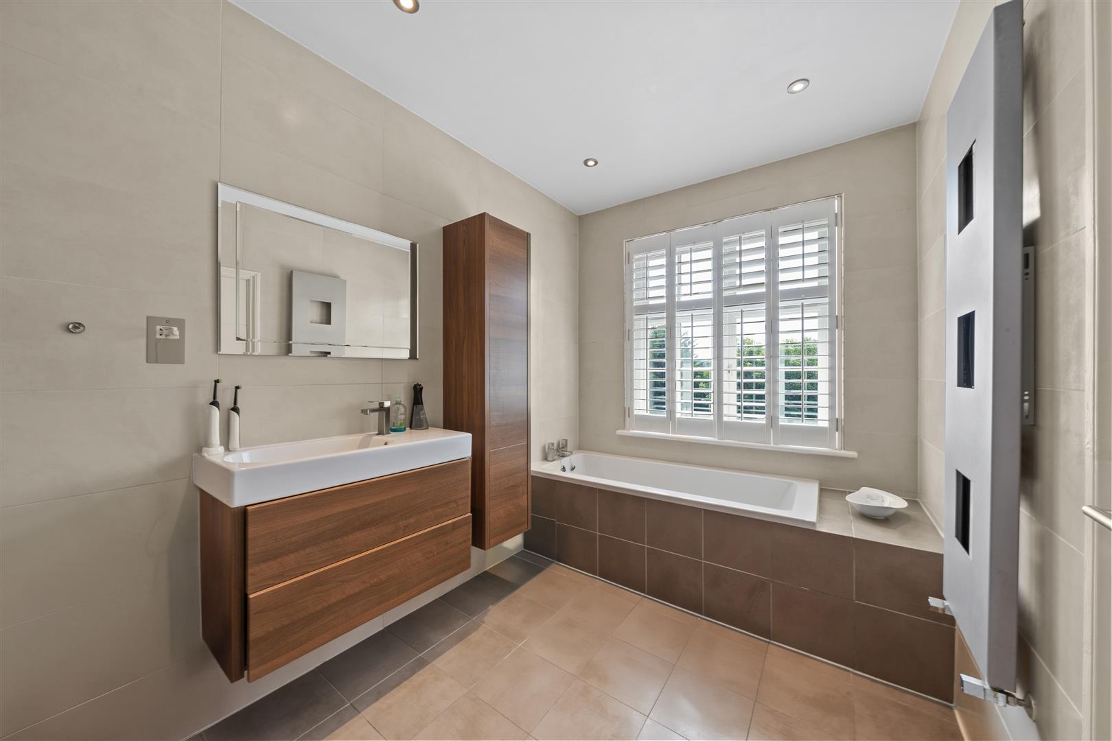 Four piece suite comprising of bath with chrome mixer tap, vanity wash handbasin with chrome mixer tap and storage below, walk in shower with rainfall showerhead and hand shower attachment, WC, shaver point, extractor fan, heated towel rail, tiled walls and flooring, double glazed window with bespoke fitted shutters.