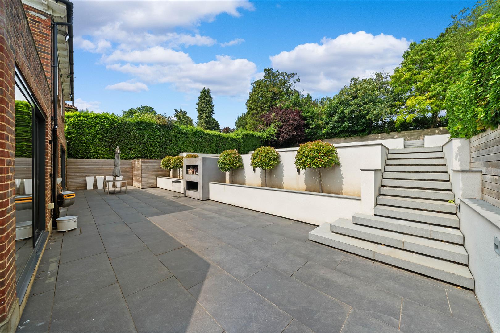 Stunning landscaped garden with large patio area, raised flower beds with shrubs and feature lighting, barbecue area, outside tap and power socket, side access, steps up to two tiered lawn sections, raised flower beds with flowers.