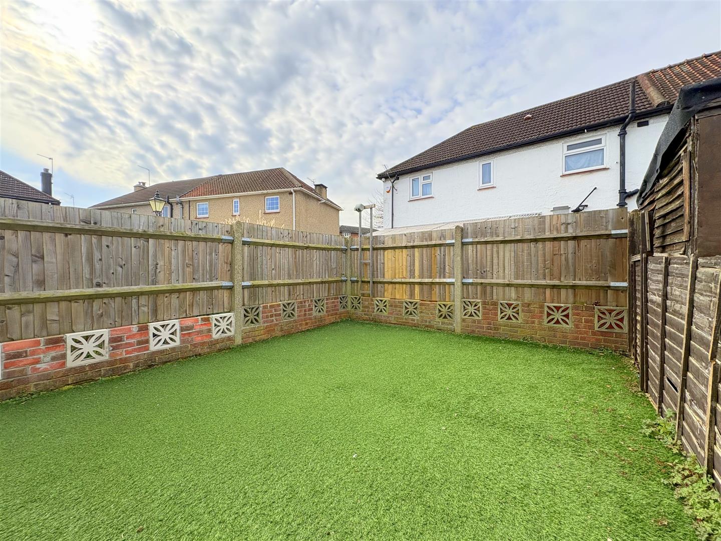 Paved patio area leading to artificial lawn section, outside tap, fence enclosed with gated side access.