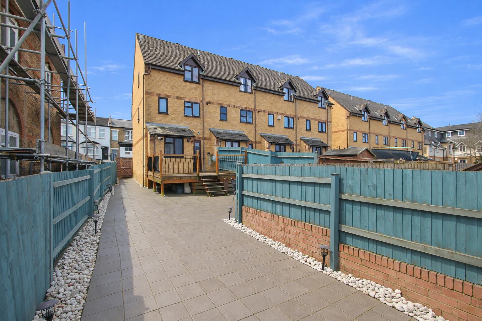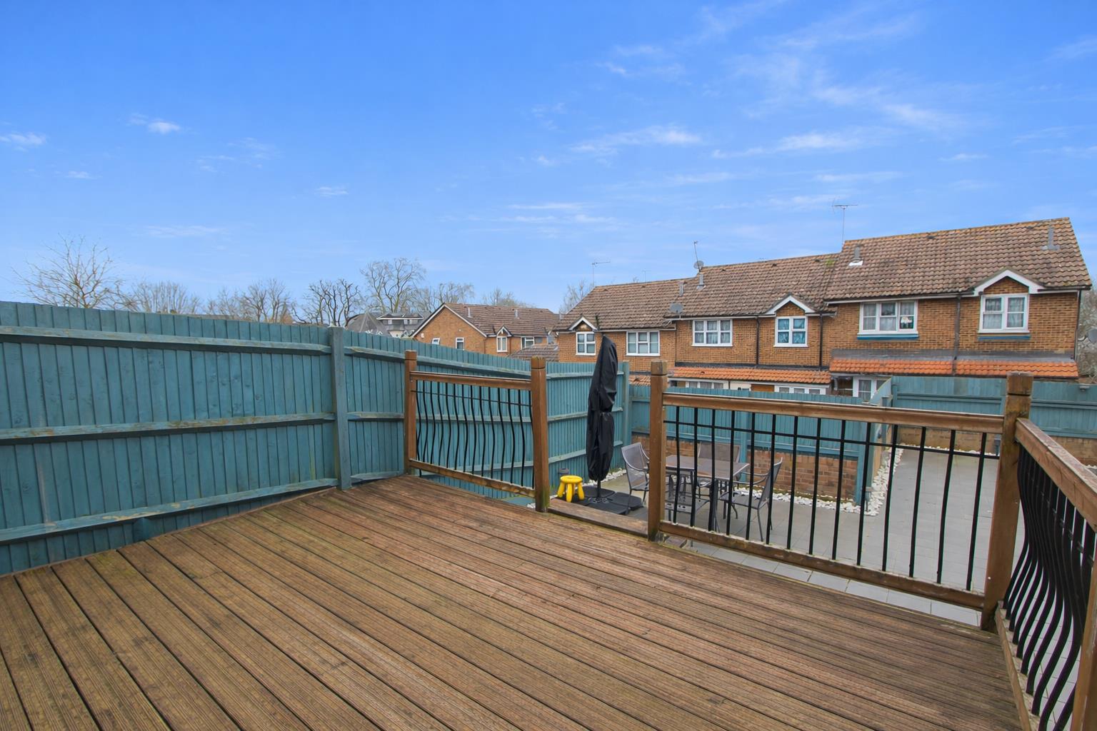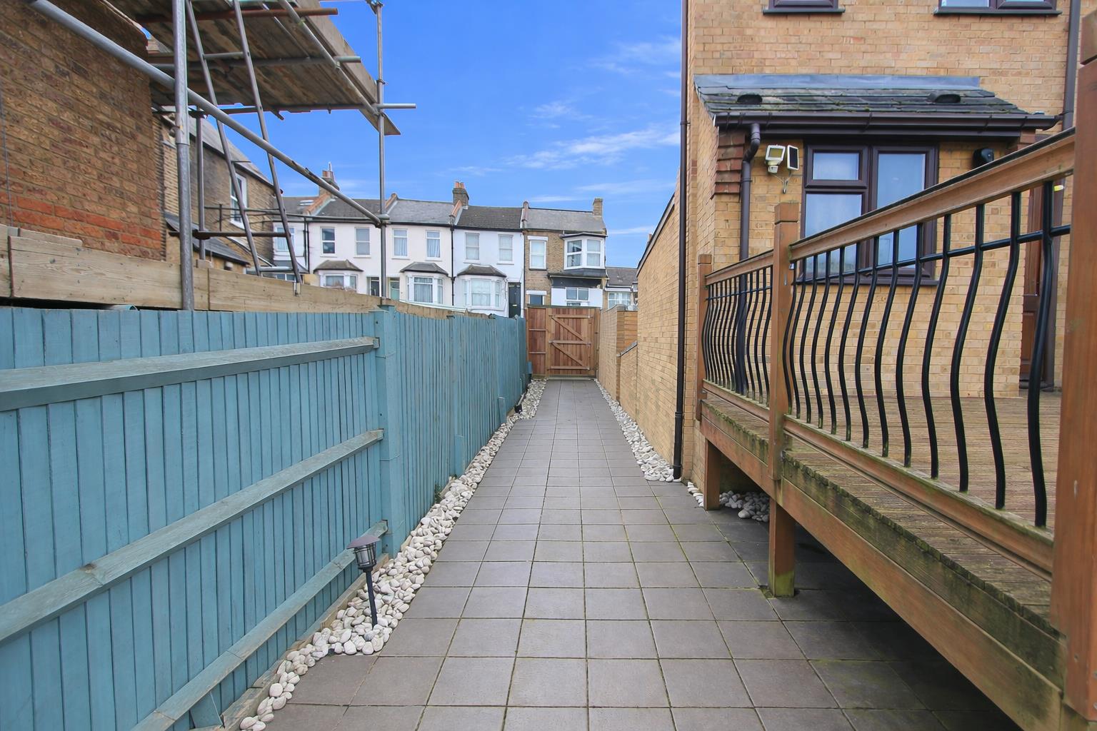 Elevated decking area, steps down to paved garden, gate providing side access, fence enclosed, water tap and outdoor power socket.