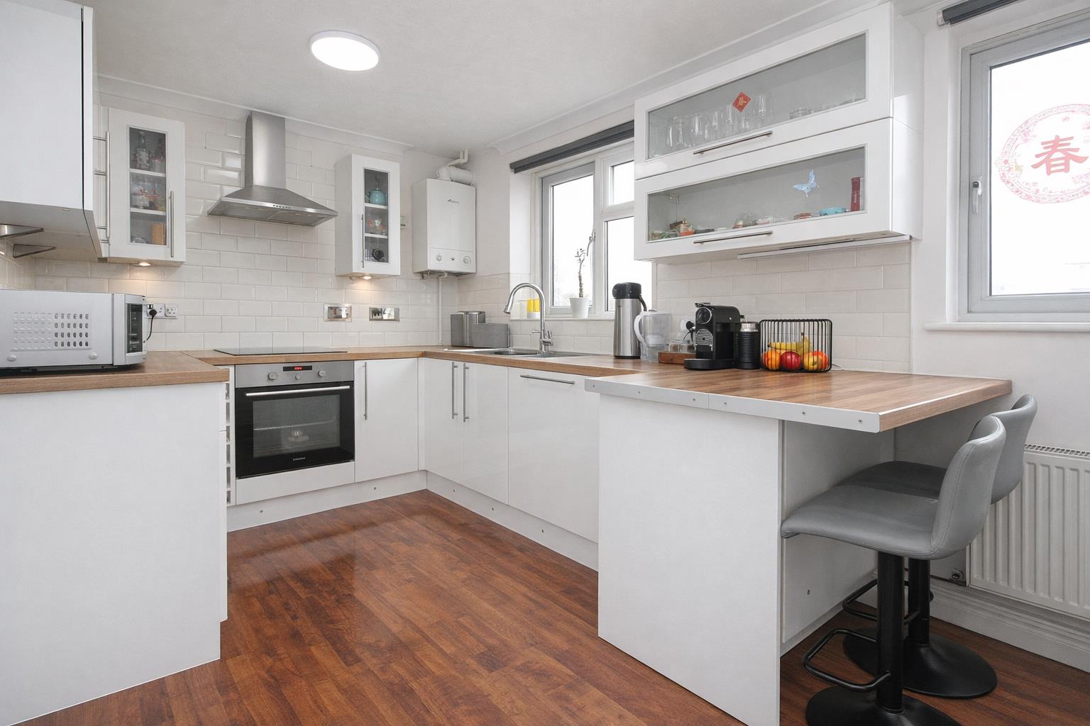 Range of modern white gloss fitted kitchen units and drawers, laminate worktop, inset one and a half bowl stainless steel sink with chrome mixer tap, integrated oven, induction hub with chrome extractor hood above, integrated dishwasher, tiled splashback, wall mounted 'Worcester' boiler, radiator, laminate flooring, double glazed windows to rear aspect.