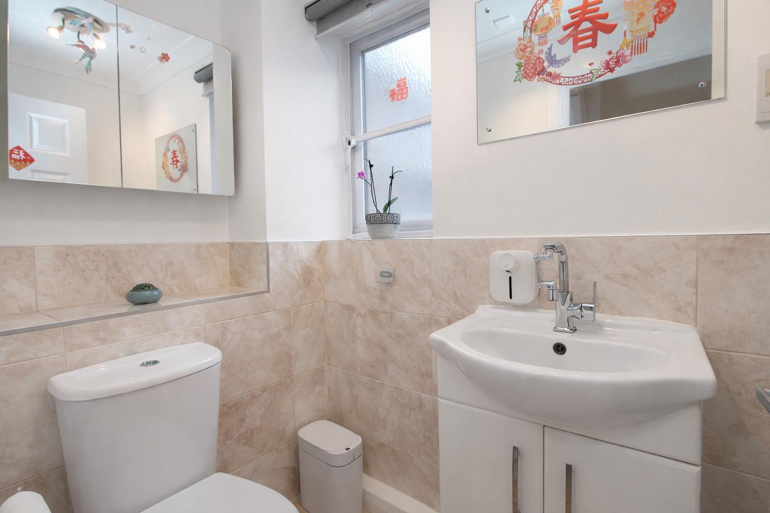 Vanity wash hand basin with chrome mixer tap and storage below, shaver point, WC, part tiled walls, heated chrome towel rail, double glazed obscure window to side aspect