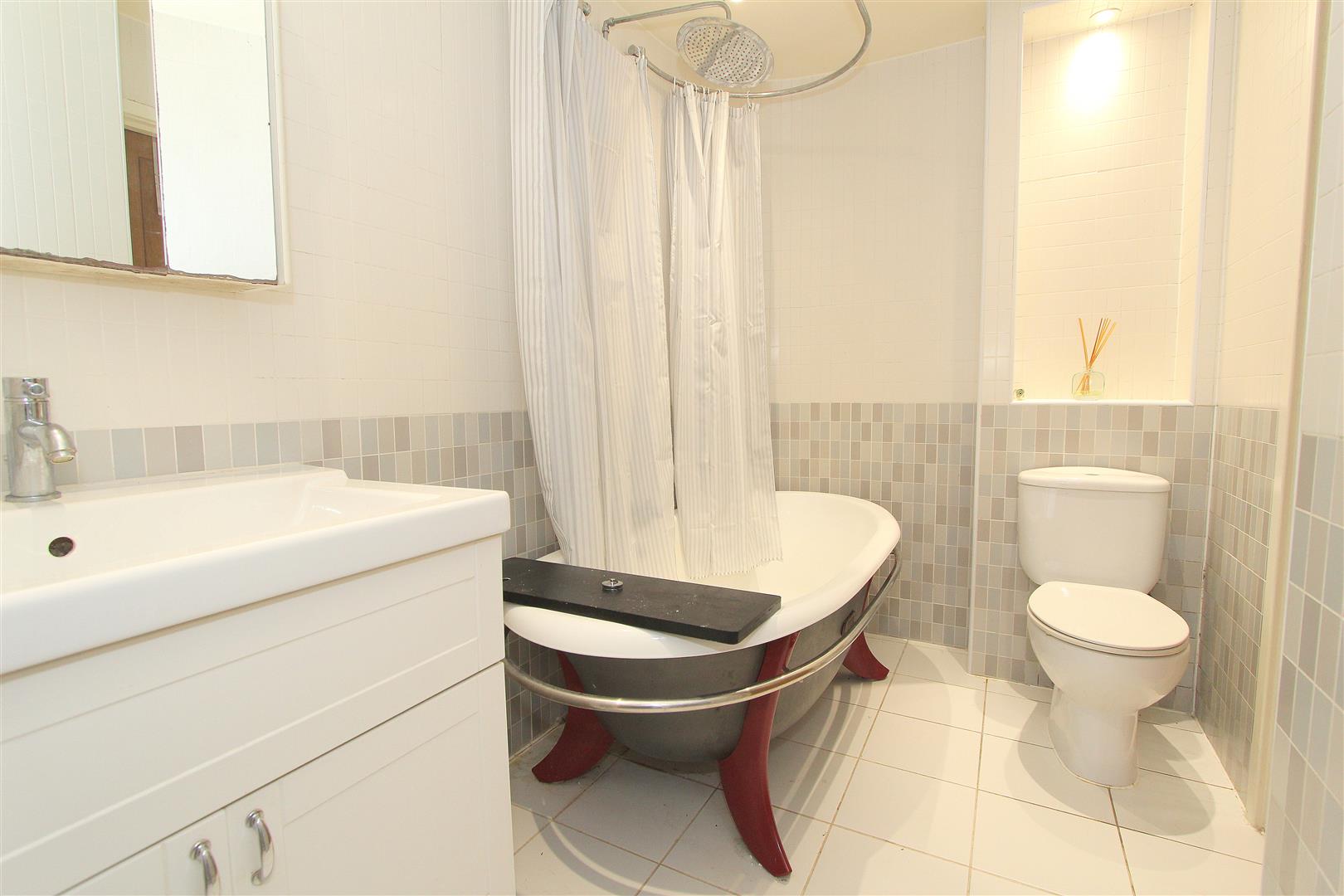Comprising freestanding roll top bath tub with chrome mixer tap and thermostatic shower, large wash hand basin with chrome mixer tap and storage cupboard below, low-level push button flush WC, heated chrome towel rail, extractor fan, tiled flooring, part tiled walls.