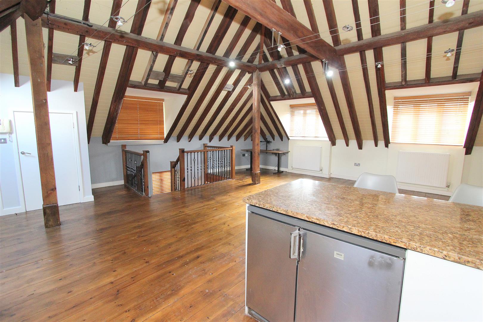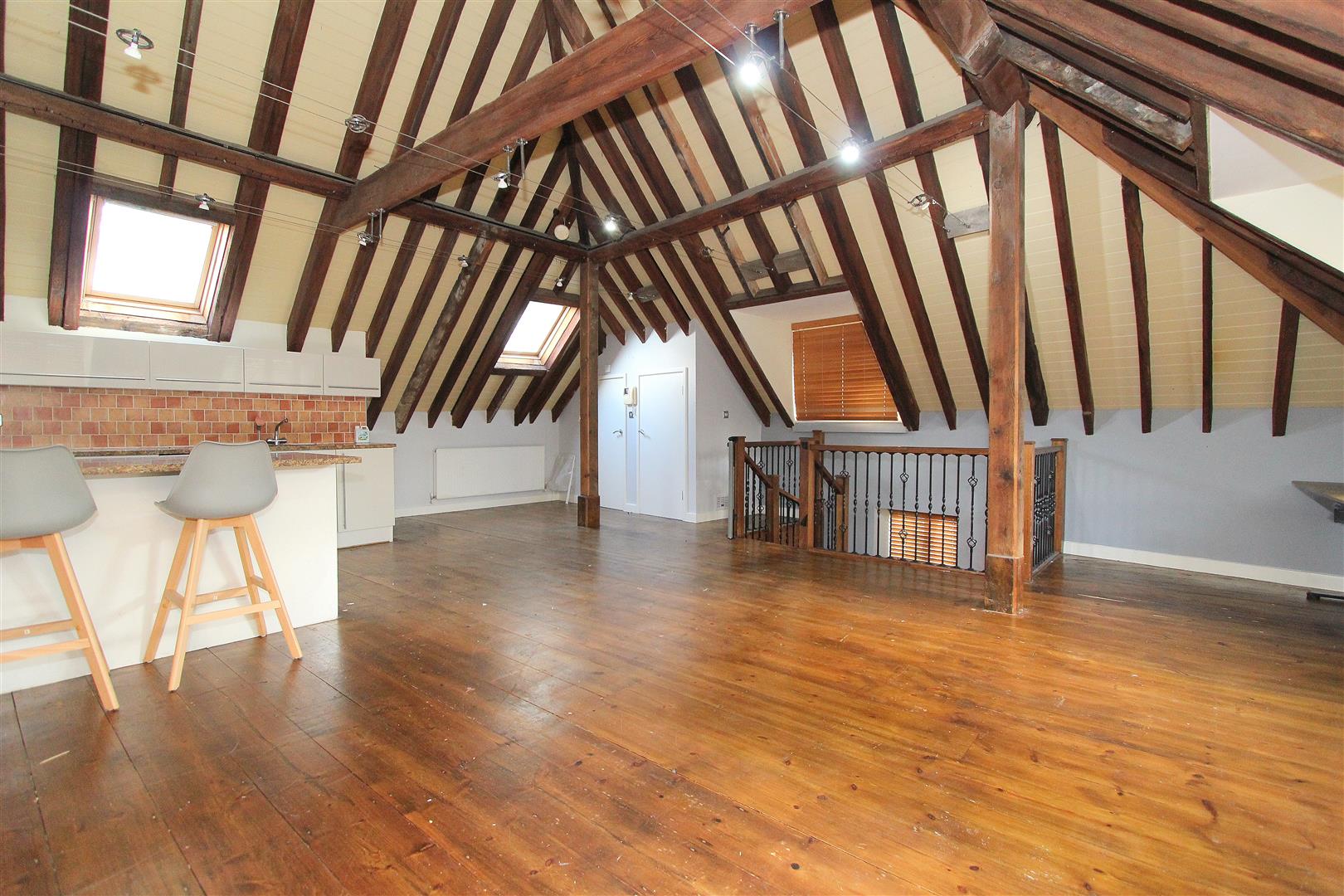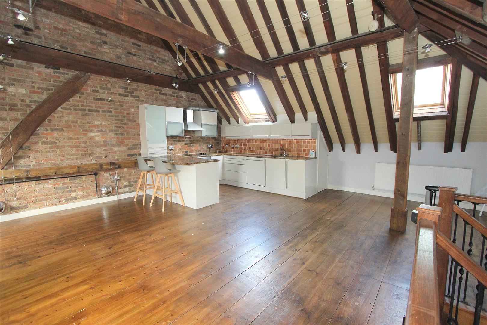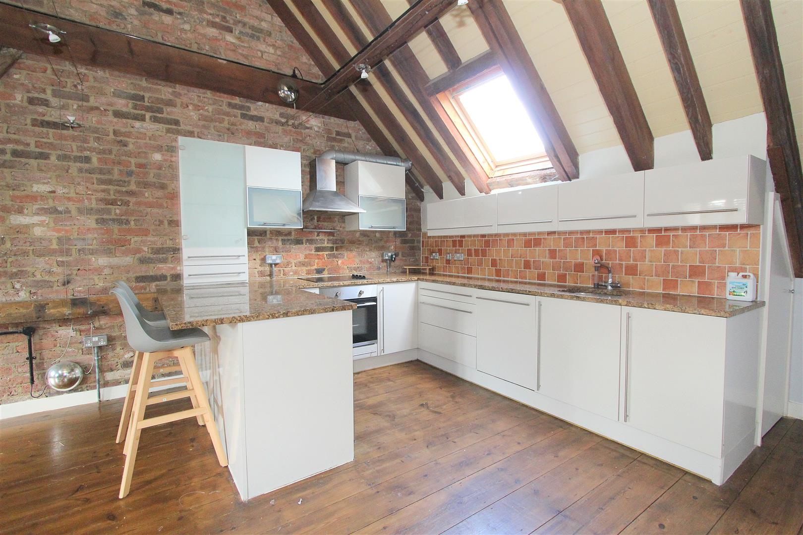 Range of fitted gloss wall units with matching cupboards and drawers below, granite worktops with inlaid stainless steel sink and chrome mixer tap, inlaid hob with oven/grill below and extractor fan above, integrated dishwasher, space for fridge and freezer, space and plumbing for washing machine, stripped floorboards, three large storage cupboards, three double panelled radiators, double glazed windows to front and side aspects and Velux windows to rear, feature beamed ceiling and walls.