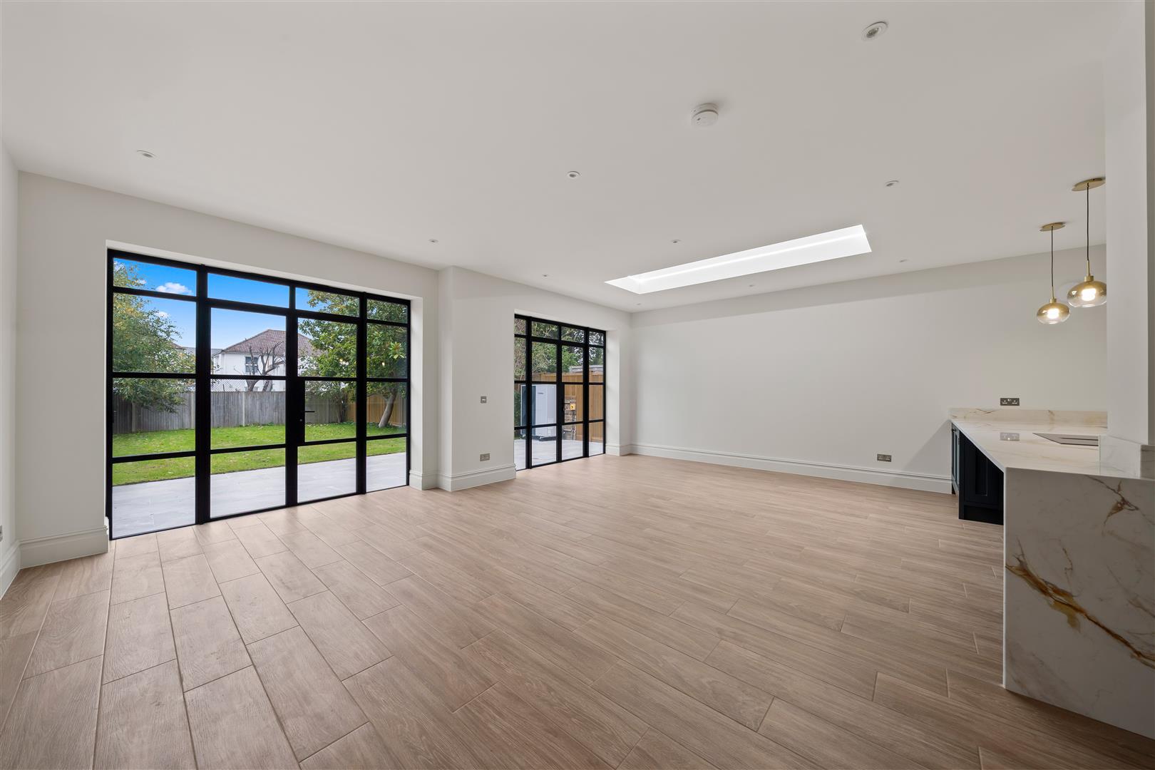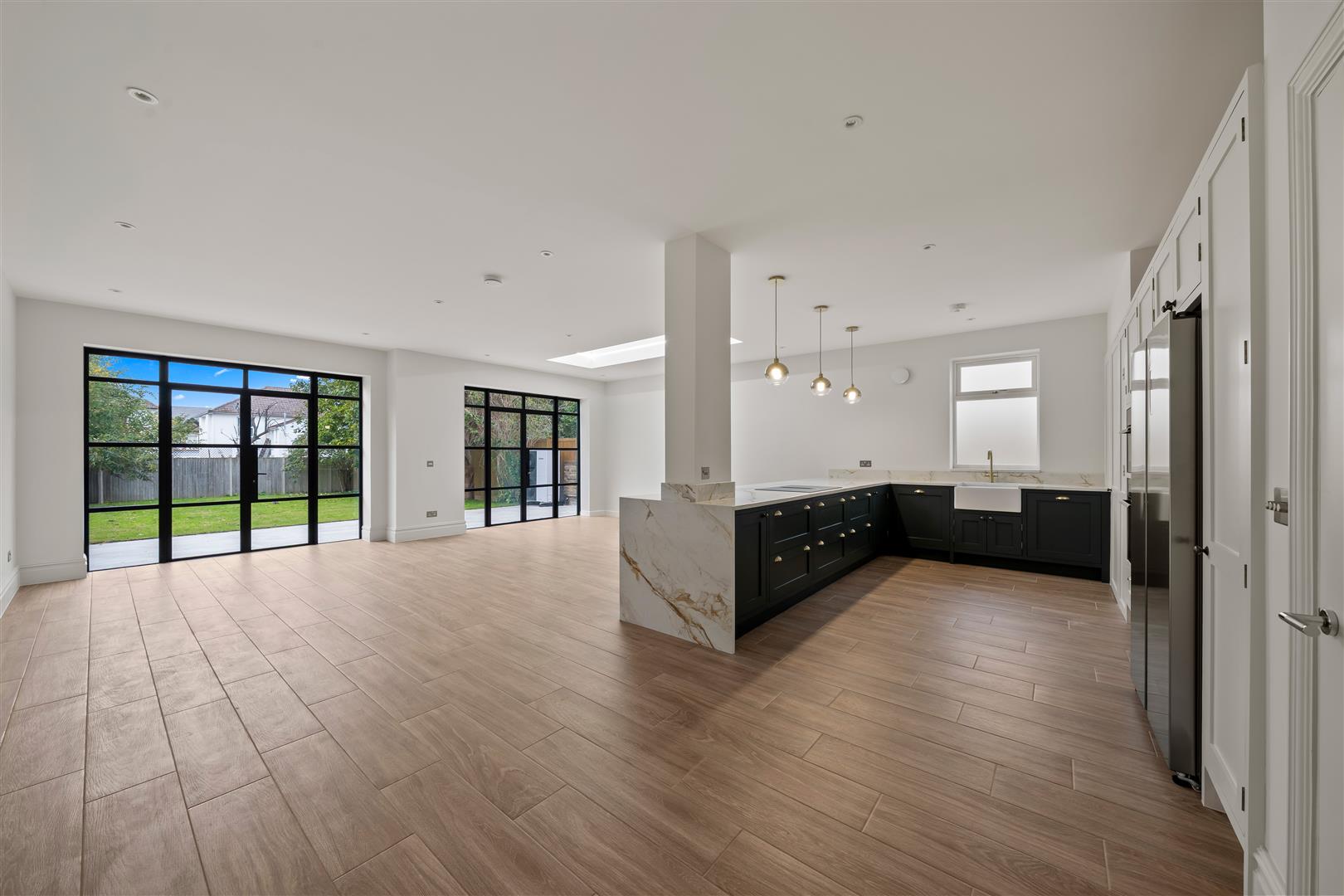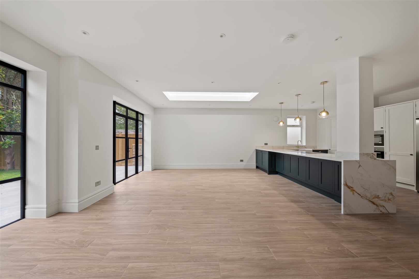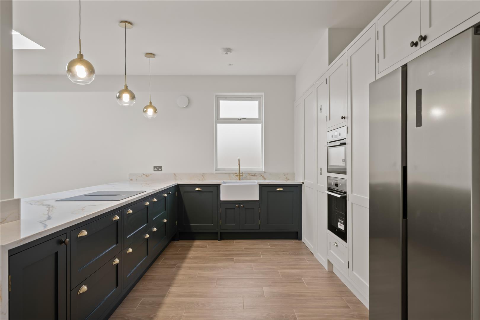Breakfast bar and storage cupboards, feature skylight with display lighting, bespoke double glazed doors to rear aspect.