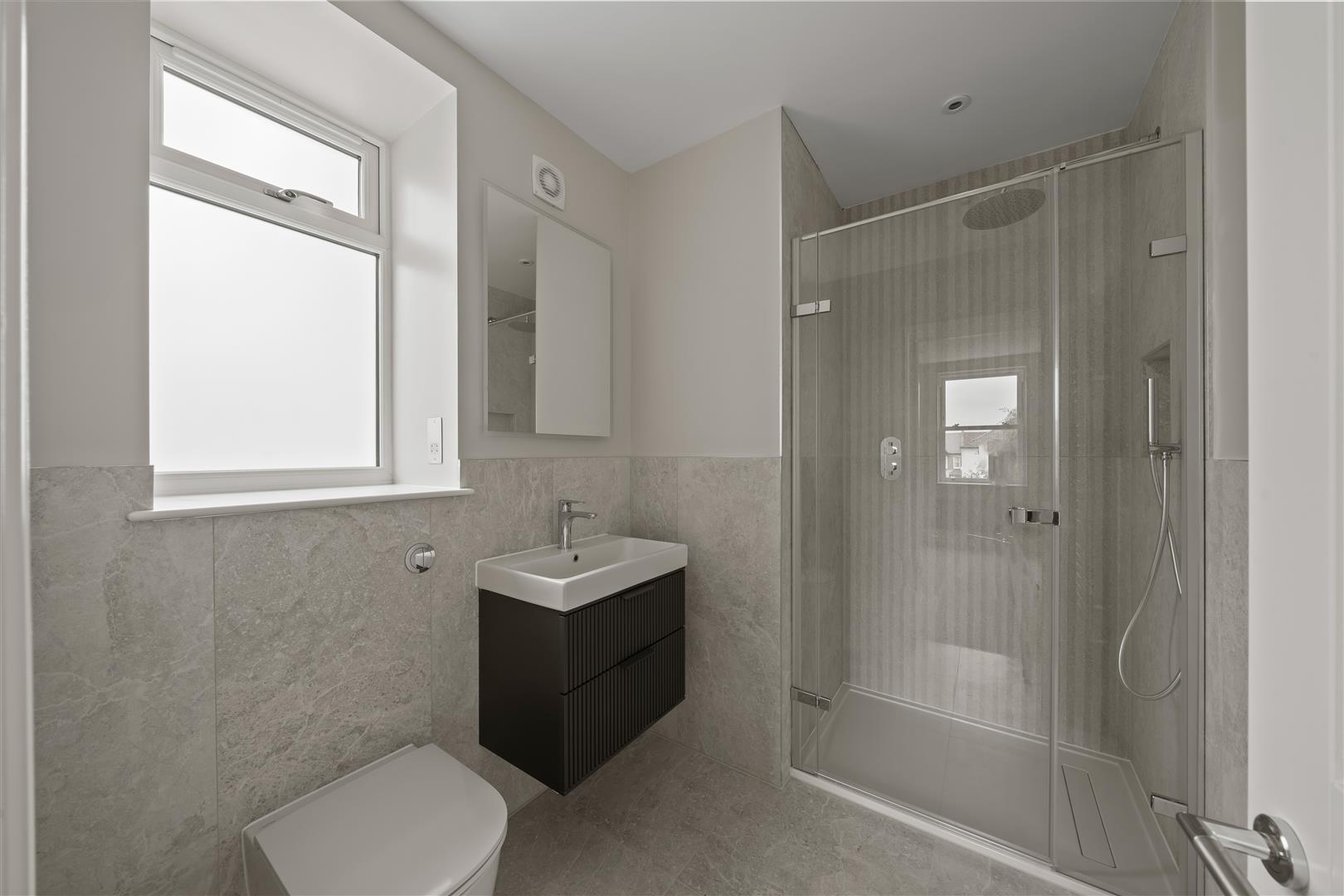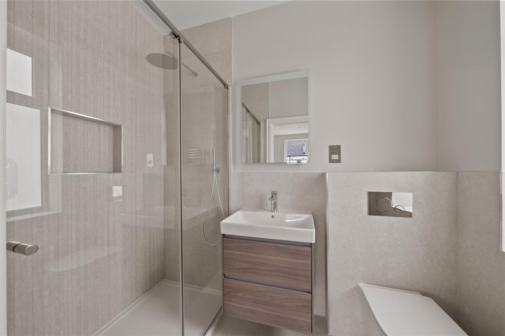 Consisting of low-level push button flush WC, panel walls, wash hand basin with chrome mixer tap and storage space below, tiled flooring with underfloor heating, extractor fan.