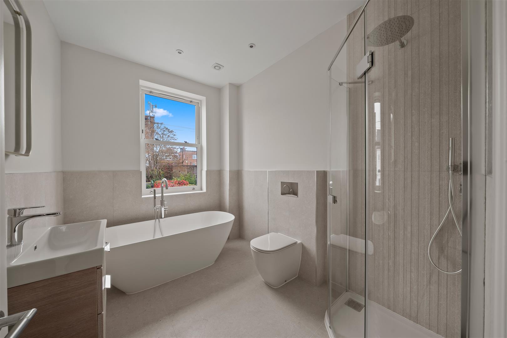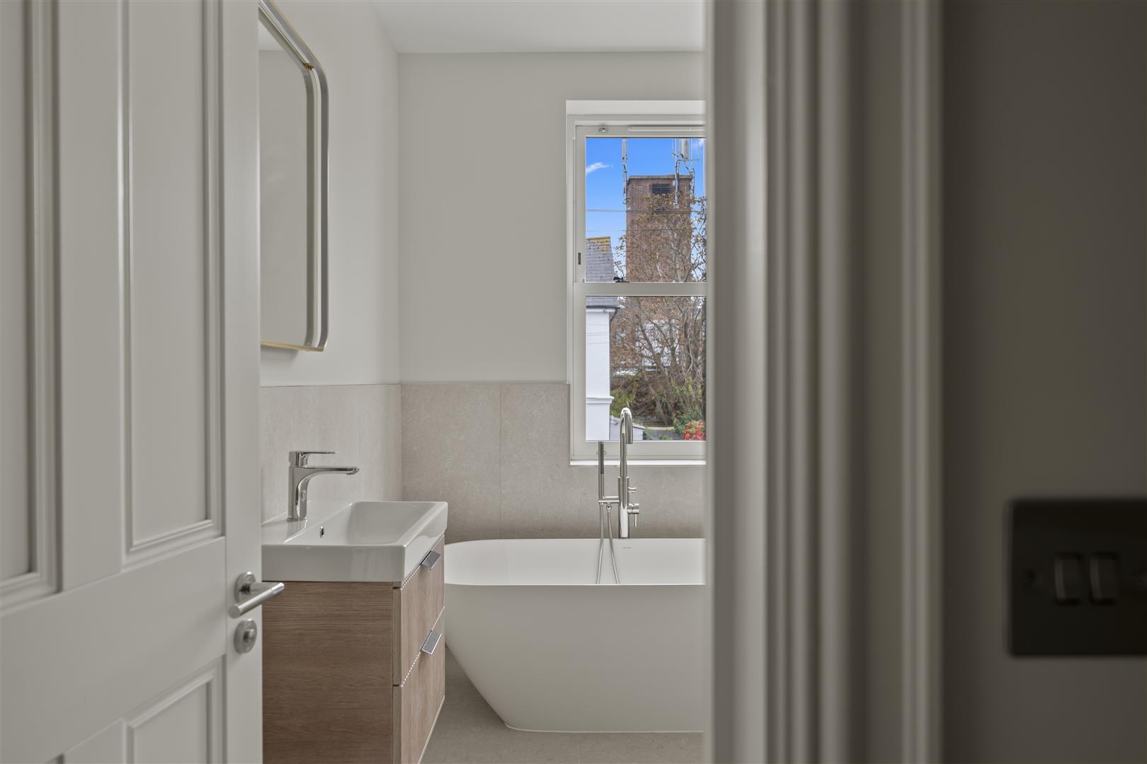 Luxury four piece suite comprising freestanding bathtub with chrome mixer tap and shower attachment, tiled cubicle with thermostatic shower and hand attachment, floating wash hand basin with chrome mixer tap and storage cupboards below, low-level push button flush WC, part tiled walls, tiled flooring with underfloor heating, fitted mirror with display lighting, shaver point, heated chrome towel rail, UPVC double glazed window to front aspect, extractor fan.