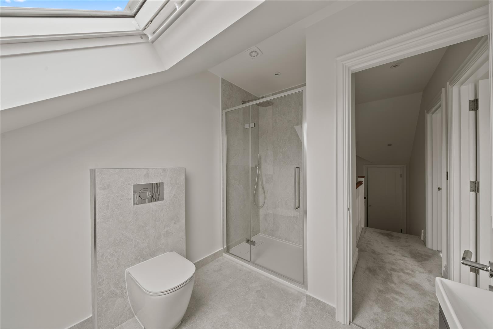 Luxury suite consisting of tiled cubicle with thermostatic shower and hand attachment, wash hand basin with chrome mixer tap and storage cupboard below, low-level push button flush WC, tiled flooring with underfloor heating, fitted mirror with display lighting, heated chrome towel rail, shaver point, Velux window to front aspect.