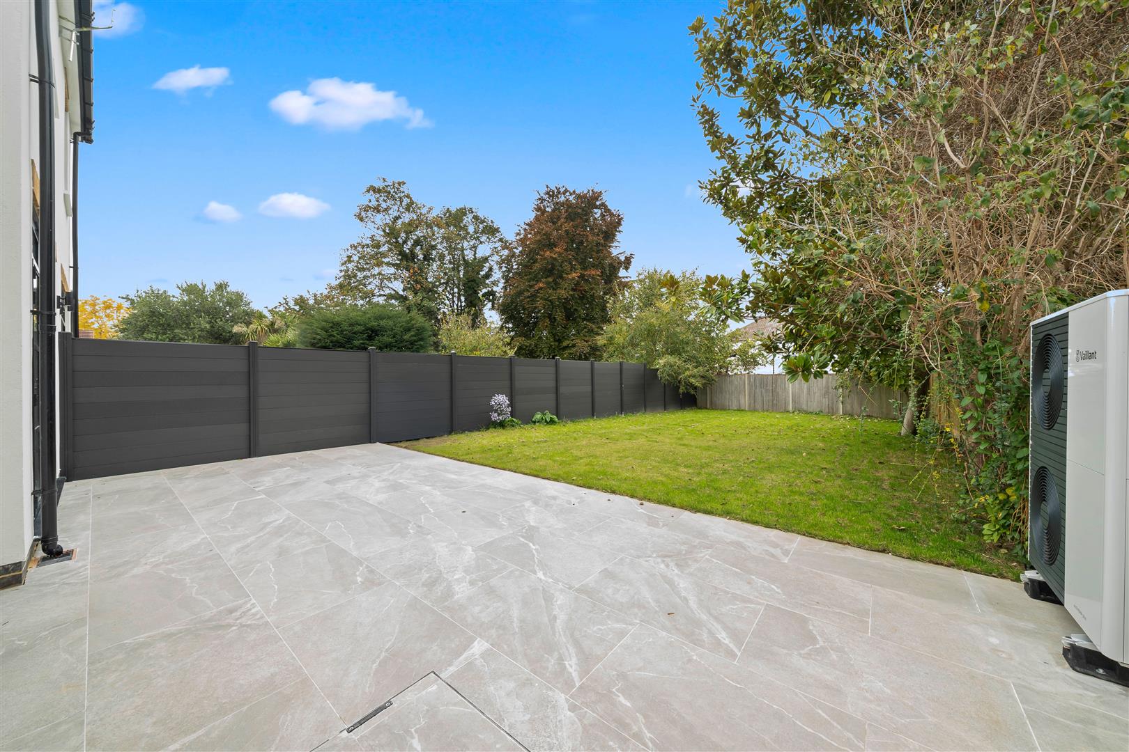 Large porcelain paved patio area leading to lawn section with shrubs bordering, gated side access, fence enclosed, outside water supply and lighting