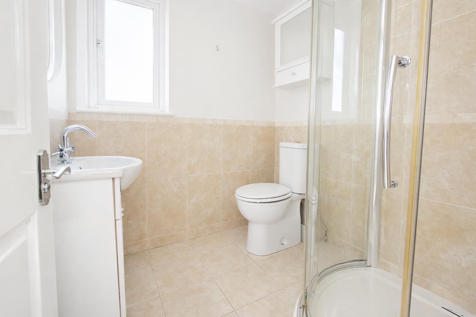 Consisting of tiled cubicle with thermostatic shower, wash hand basin with chrome mixer tap, low-level push button flush WC, heated towel rail, tiled flooring, part tiled walls, extractor fan, UPVC double glazed window to rear aspect.