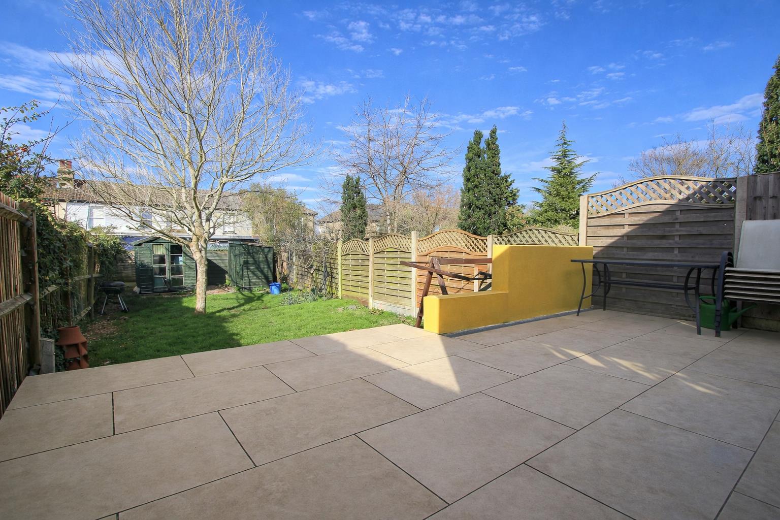 Large paved patio area with steps leading to lawn section with shrubs and flower beds bordering, two garden sheds, fence enclosed, outside water power supply, gated side access.