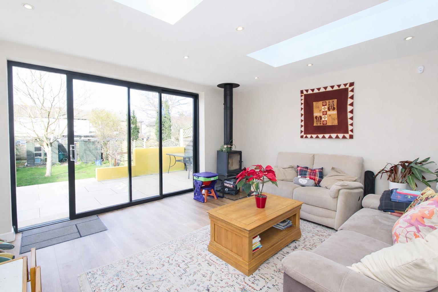 Two feature skylights and window at side, double glazed aluminium sliding doors to rear aspect, modern radiators, feature log burner, wood laminate flooring.