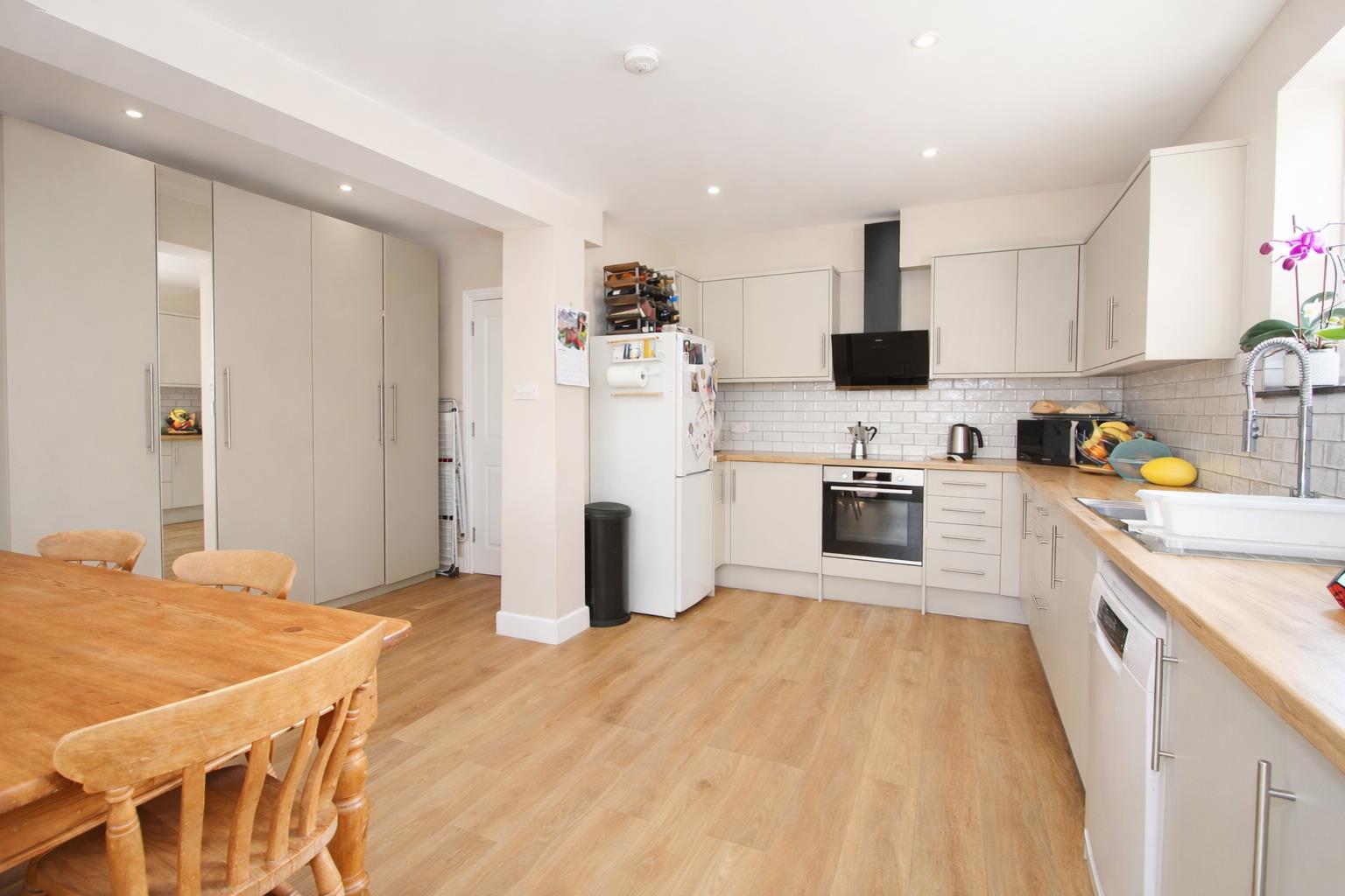 Range of fitted wall units with matching cupboards and drawers below, roll top work surfaces with inlaid stainless steel sink and chrome mixer tap with hose attachment, inlaid hob with oven/grill below and extractor fan above, space and plumbing for dishwasher, space for double tall standing fridge/freezer, tiled splash back, cupboard housing “Worcester” combination boiler, wood flooring, modern radiator, UPVC double glazed window to side aspect.