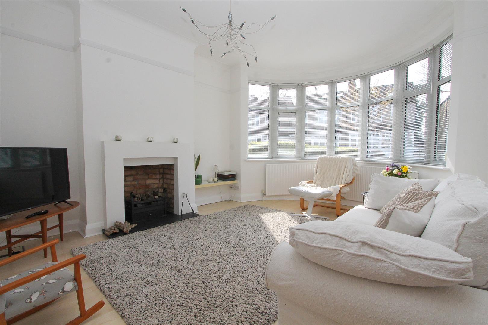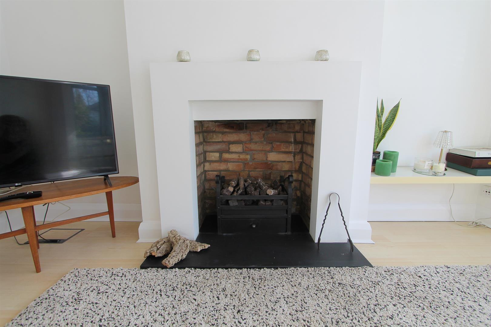 Gas fireplace, radiator, wood laminate flooring, double glazed bay window to front aspect
