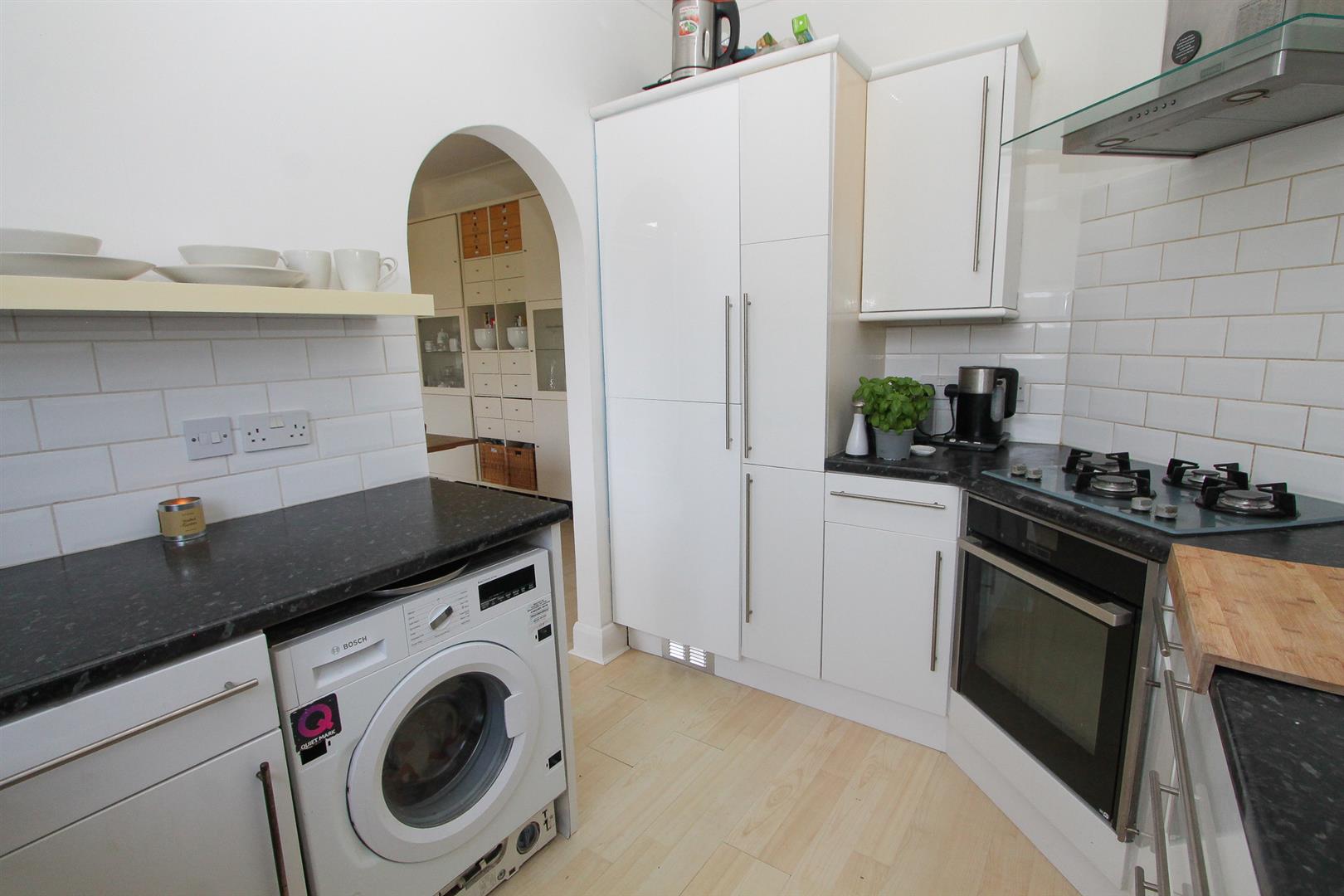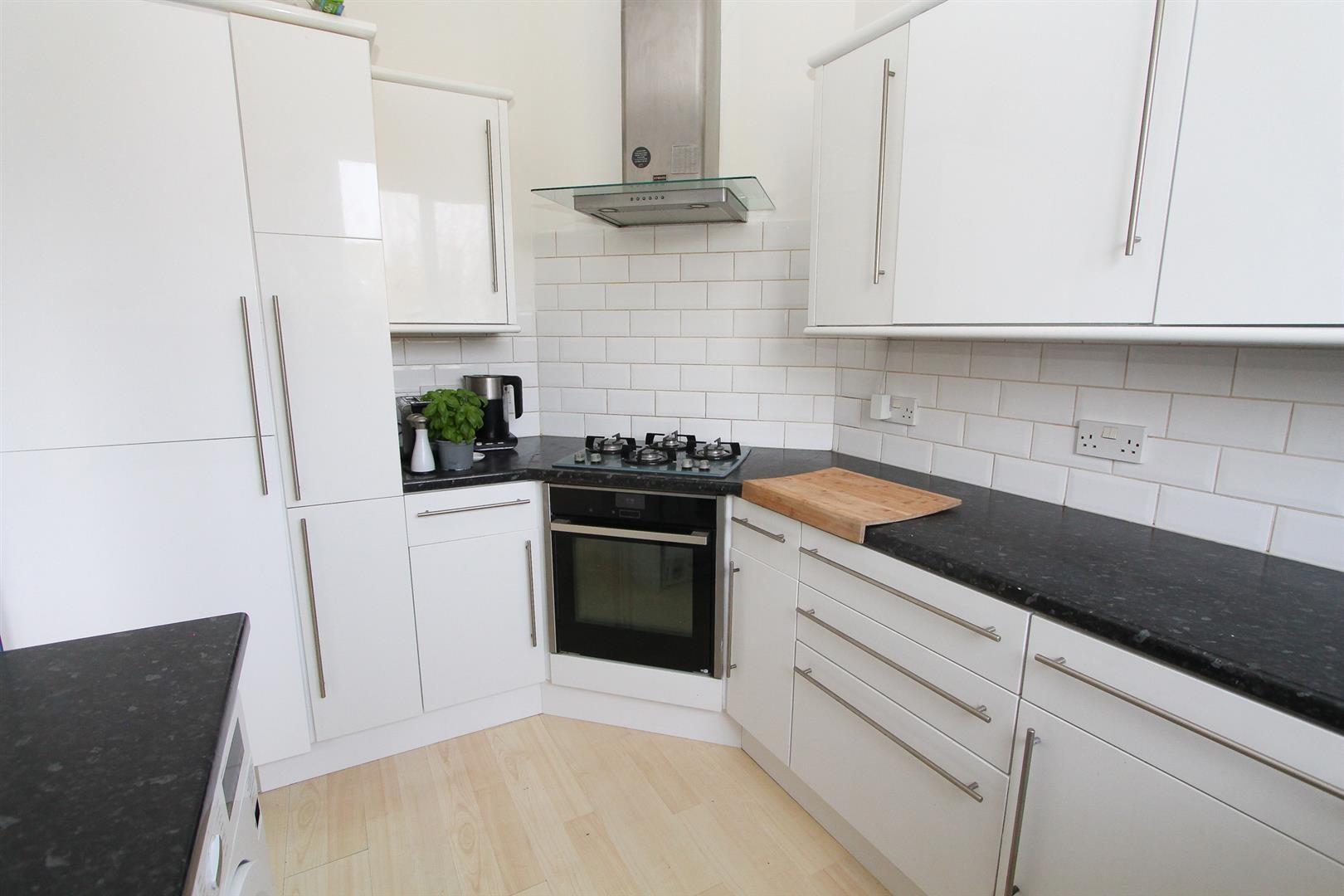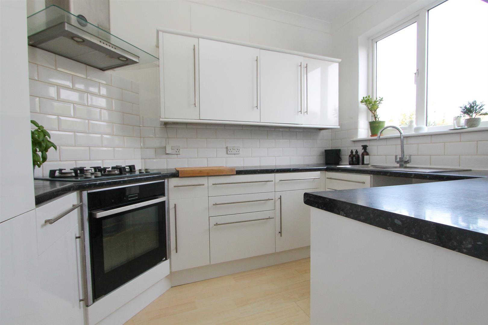 Range of modern white gloss fitted kitchen units and drawers, laminate worksurface, inset stainless steel sink with chrome mixer tap, integrated 'Neff' oven, 'Hotpoint' gas hob, chrome extractor hood above, integrated fridge, space and plumbing for washing machine and dishwasher, tiled splashback, double glazed window to rear aspect, wood laminate flooring.
