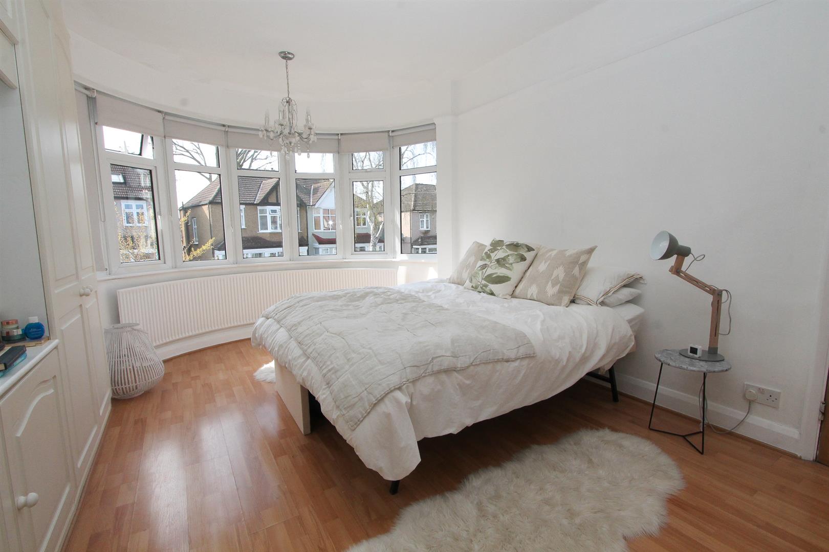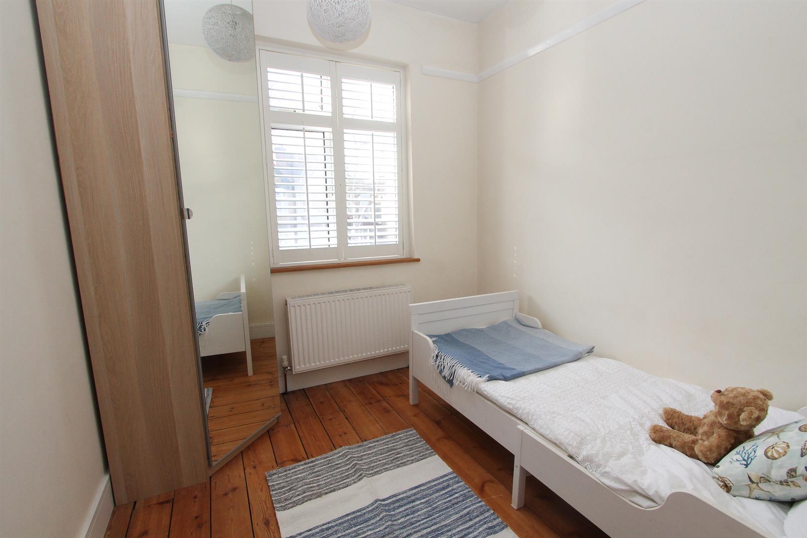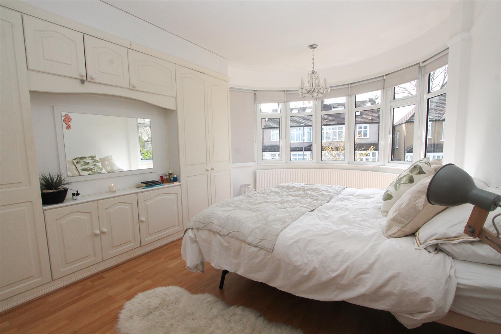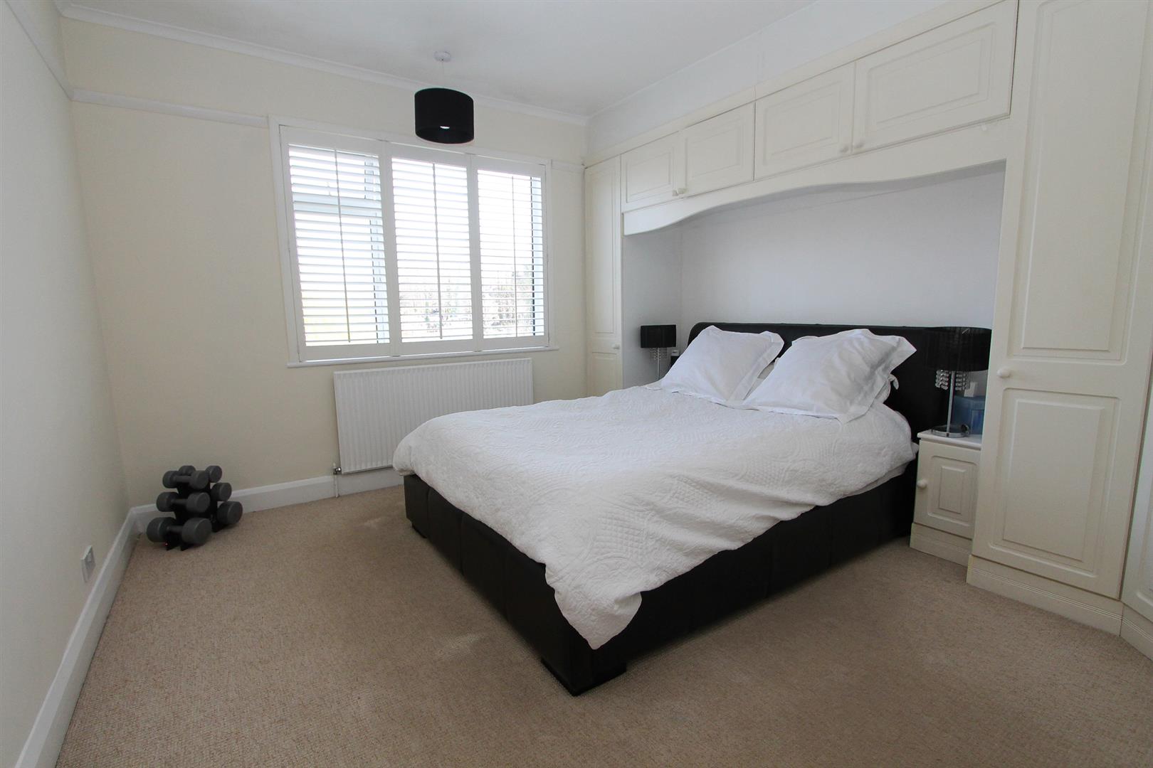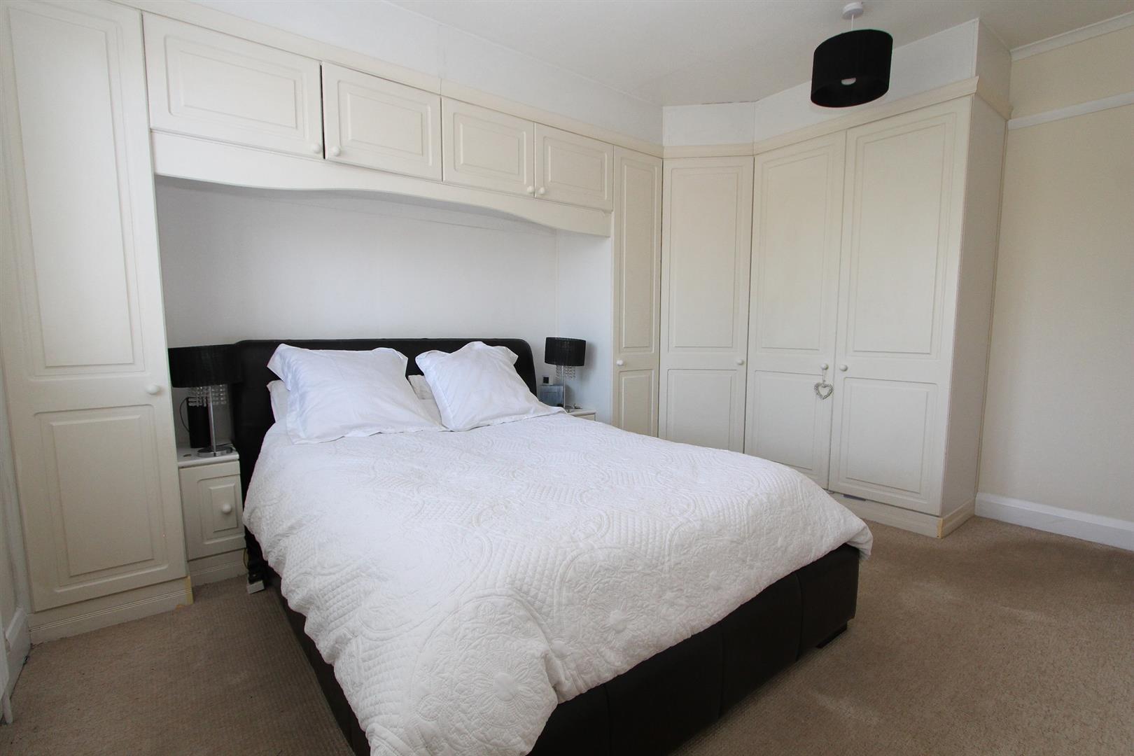 Range of fitted wardrobes and cupboards, wood laminate flooring, radiator, double glazed bay window to front aspect