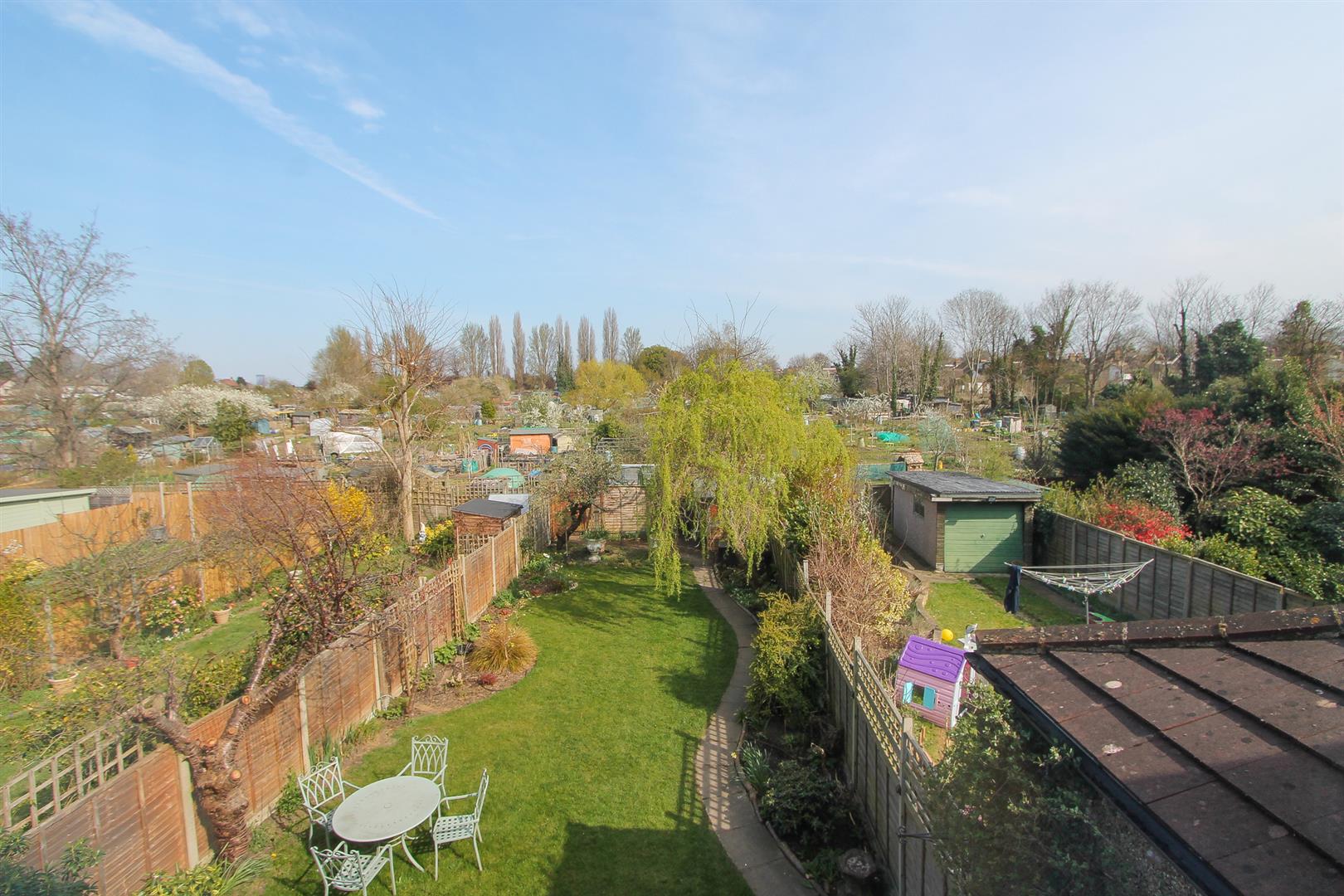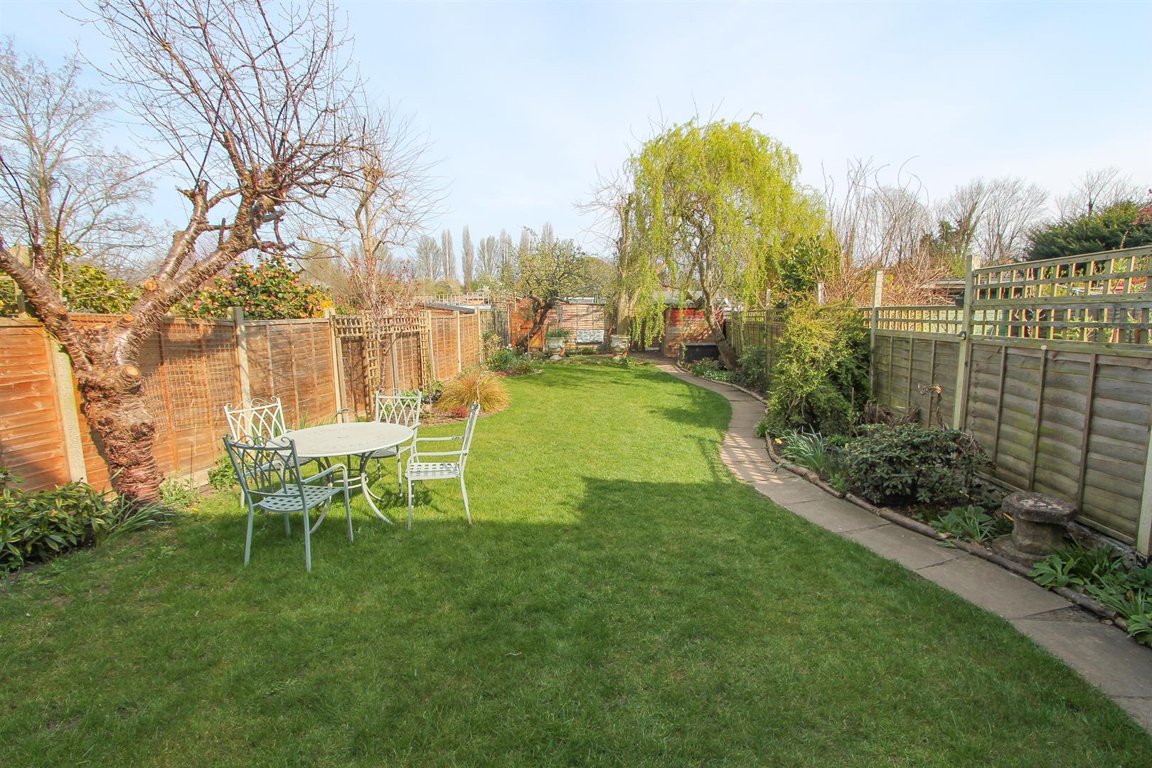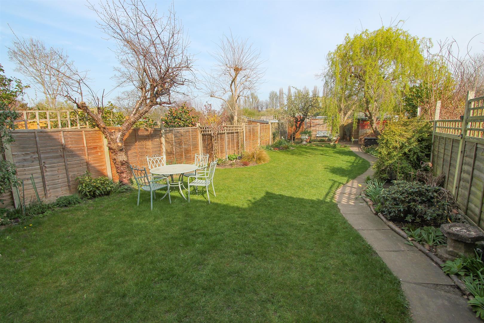Beautifully maintained rear garden mainly laid to lawn with shrubs and flowers bordering, decking area, rear access, shed, side access.