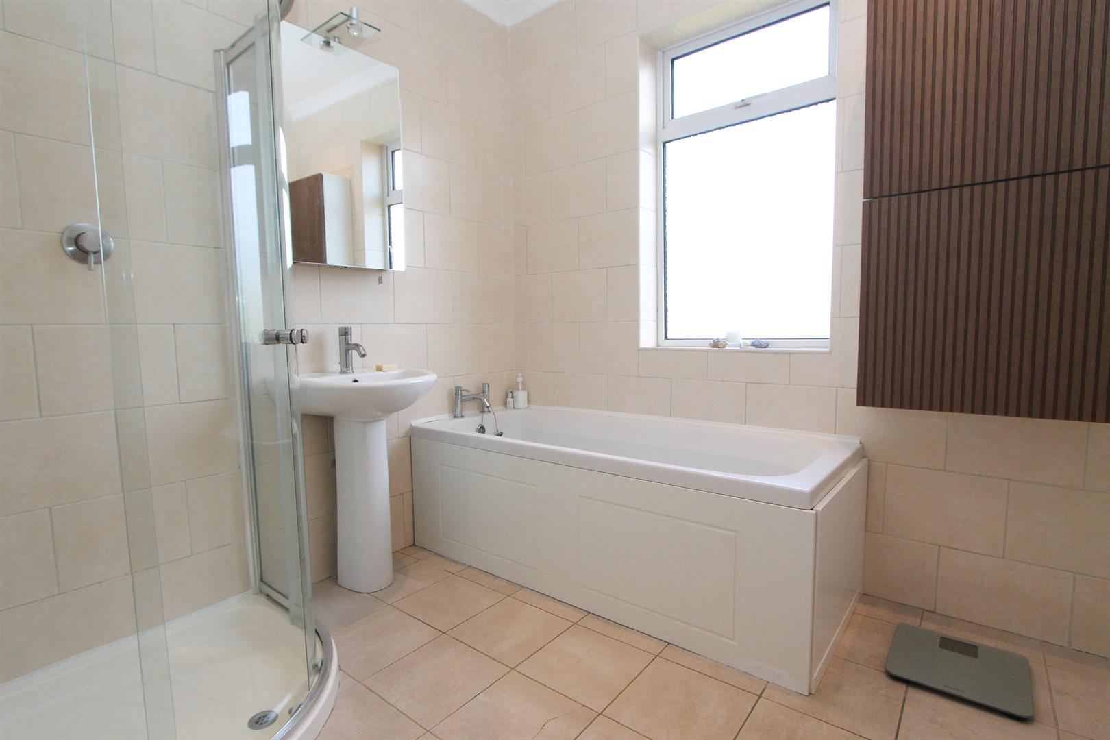 Corner shower cubicle with sliding doors, thermostatic shower, pedestal wash handbasin with chrome mixer tap, panel enclosed bath with chrome mixer tap, radiator, part tiled walls, tiled flooring, double glazed obscure window to rear aspect