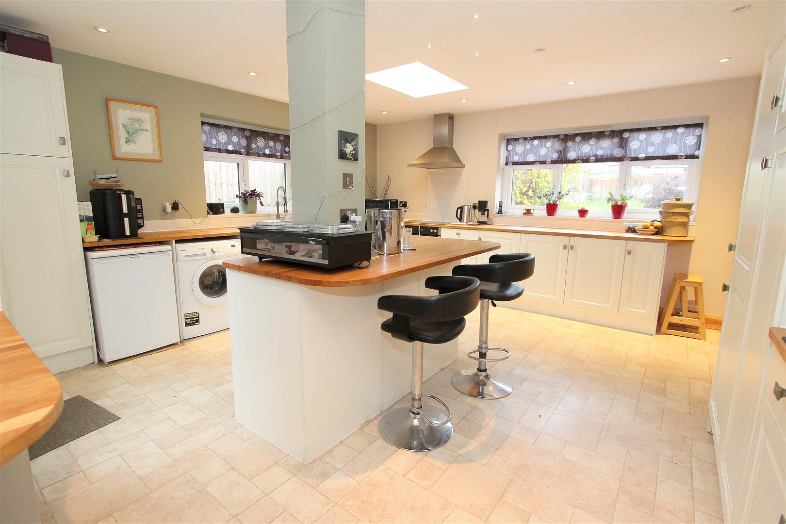 Range of fitted wall units with matching cupboards and drawers below, wooden worktops with inlaid stainless steel sink and chrome mixer tap with hose attachment, inlaid induction hob with extractor fan above and oven/grill at side, integrated dishwasher, space and plumbing for washing machine and tumble dryer, integrated fridge/freezer, tiled effect flooring, island with breakfast bar, UPVC double glazed windows to side and rear aspects and door leading to garden, feature skylight, double panel radiator.