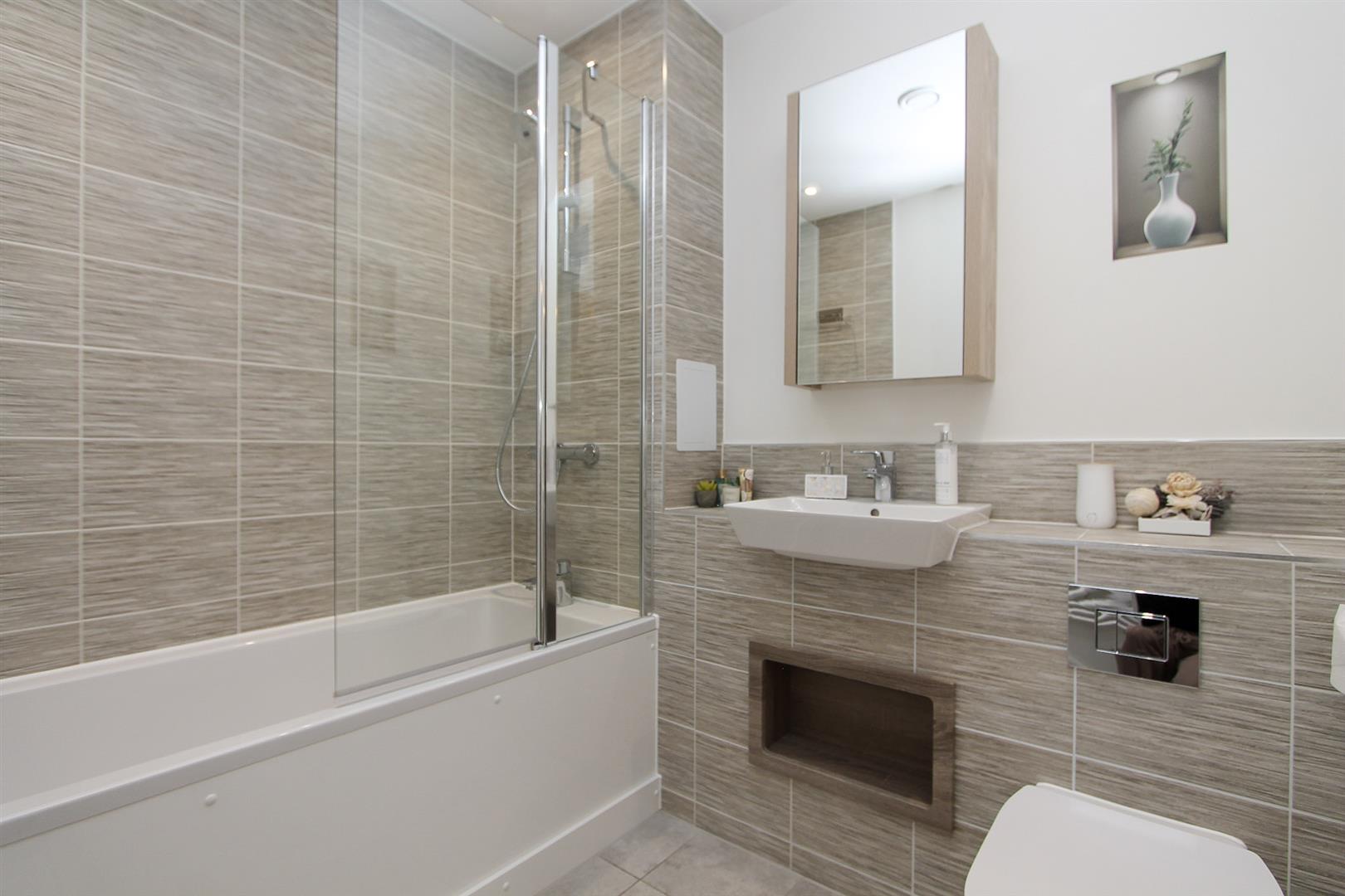 Modern three-piece suite comprising of bath with shower screen and chrome mixer tap, thermostatic shower, wash hand basin with chrome mixer tap, enclosed WC, heated towel rail, tiled walls and flooring, extractor fan.