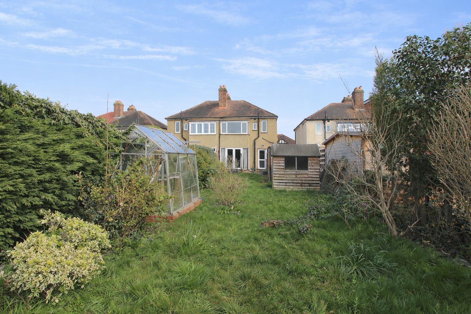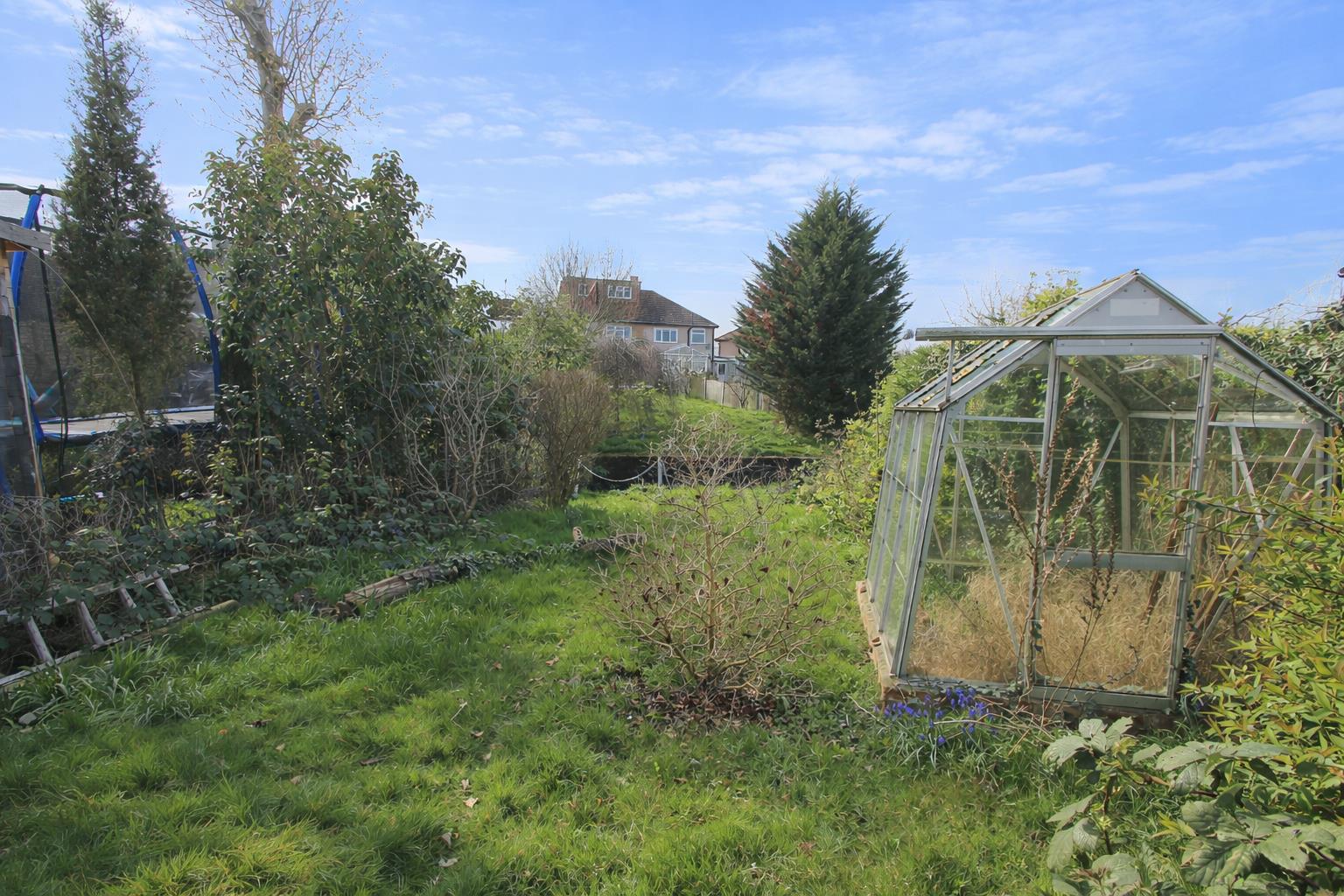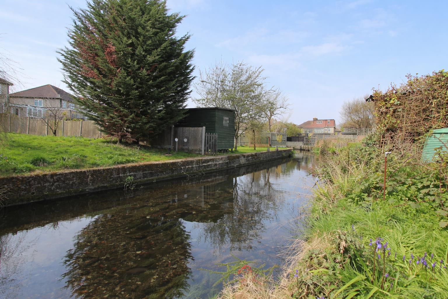 Rear garden (backing directly onto the River Wandle) Approximately 80ft Hardstanding seating area with footpath at side, mainly laid to lawn with mature shrubs and plants bordering, garden shed, greenhouse.