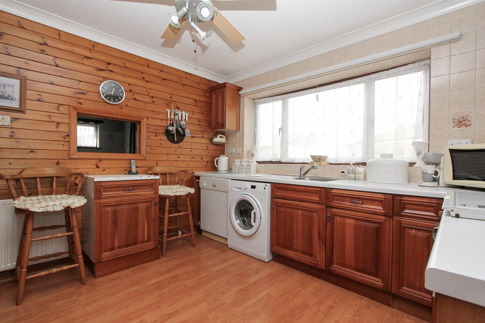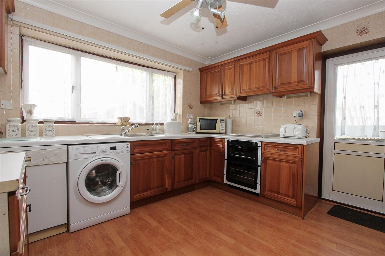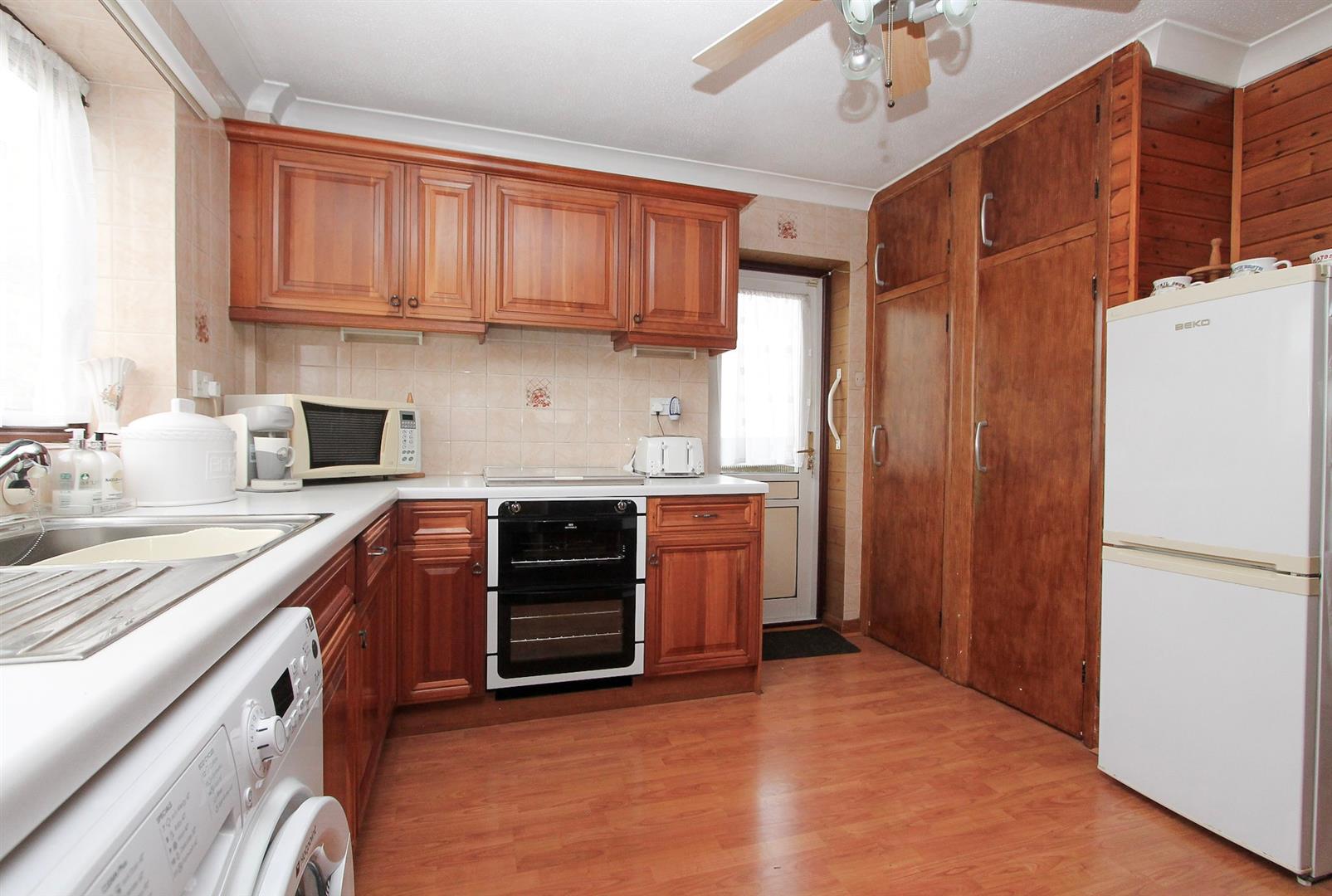 Range of fitted kitchen cupboards and drawers, laminate worktop, inset stainless steel sink with chrome mixer tap, integrated oven/grill, gas hob with extractor fan above, space for fridge freezer, dishwasher and washing machine, pantry cupboards,