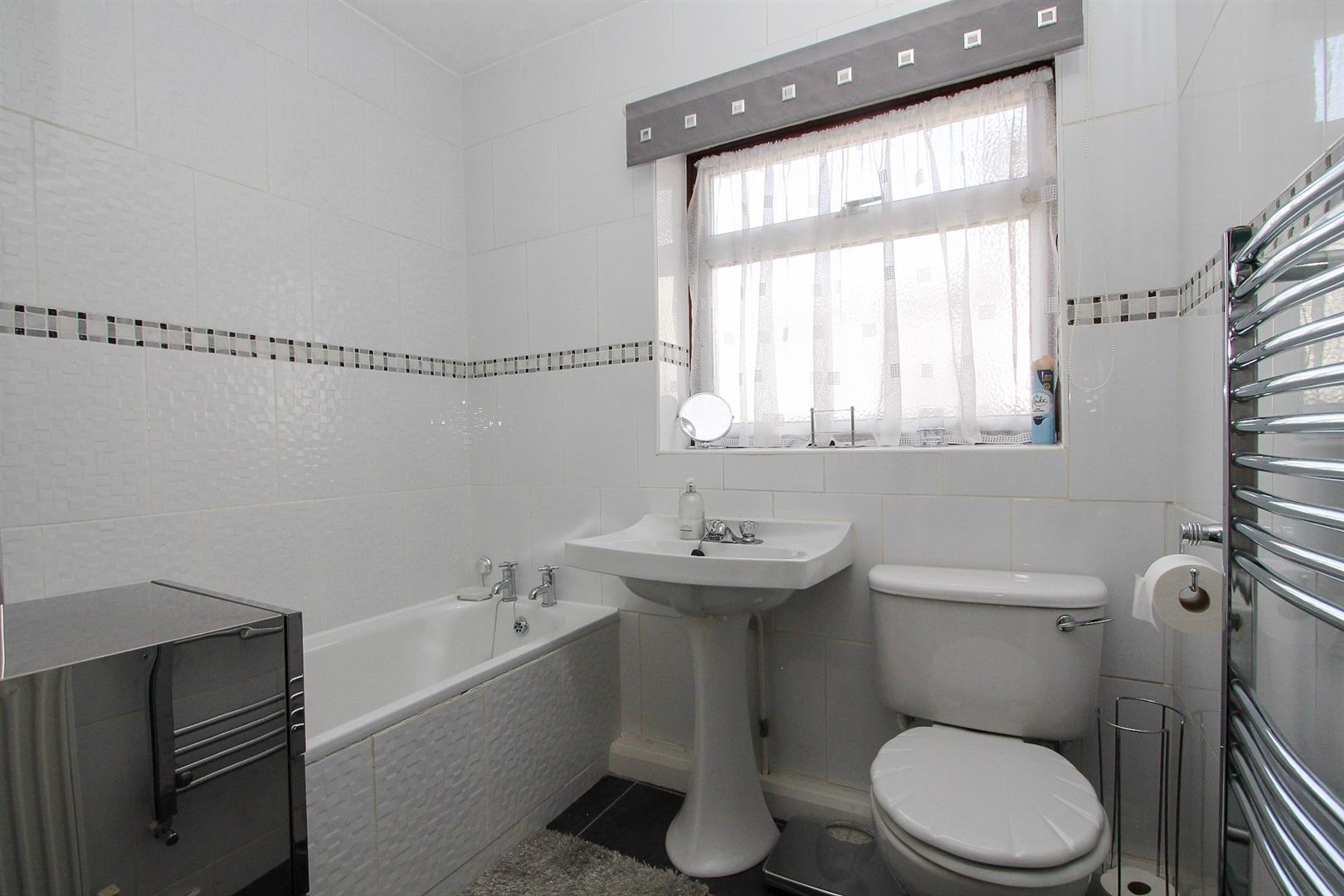 Three-piece suite comprising bath with concertina shower screen and chrome taps, electric 'Triton' shower, pedestal wash hand basin with chrome mixer tap, WC, heated chrome towel rail, radiator, tiled walls and flooring, double glazed obscure window to side aspect