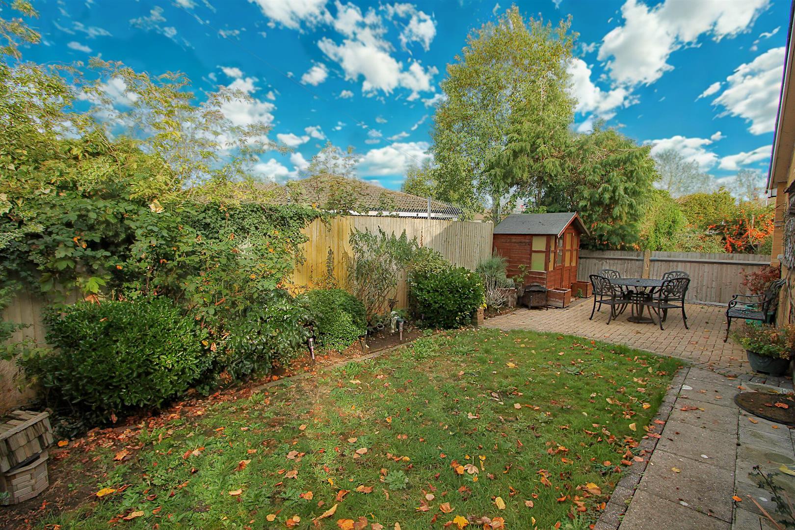 Well-maintained garden with paved patio area, lawn section, borders with mature shrubs and flowers, access to garage, side access.