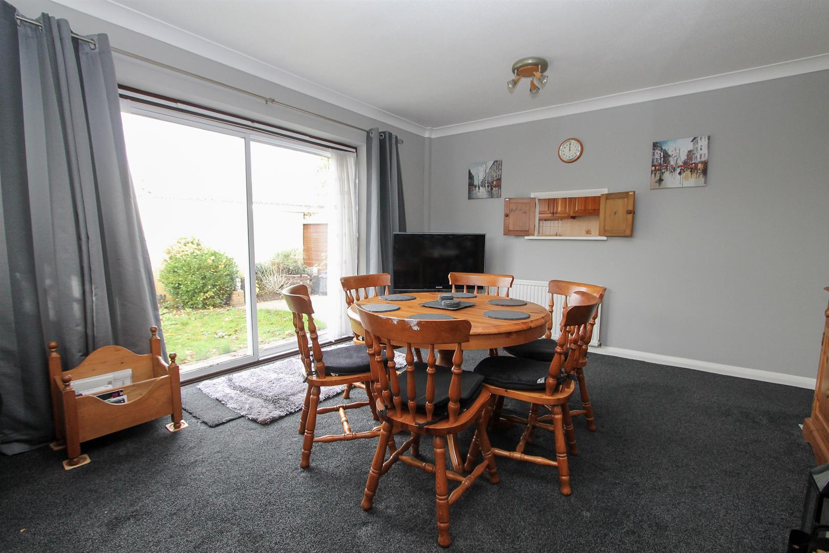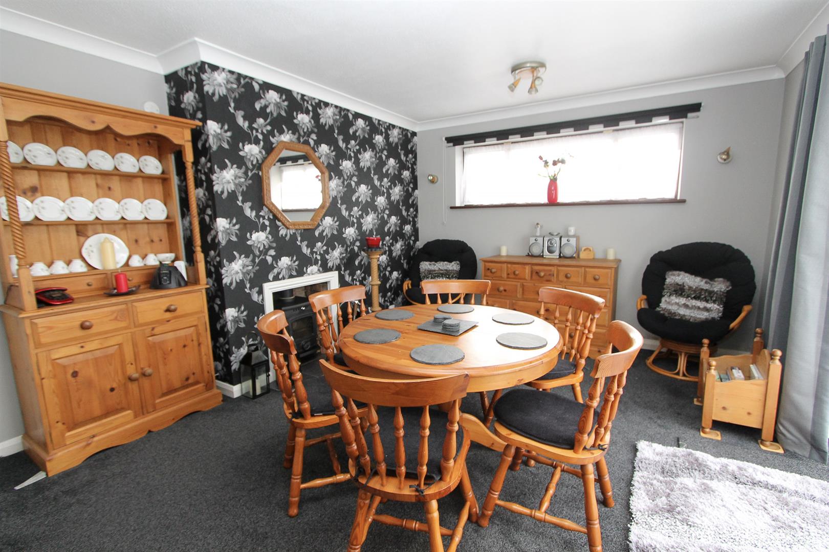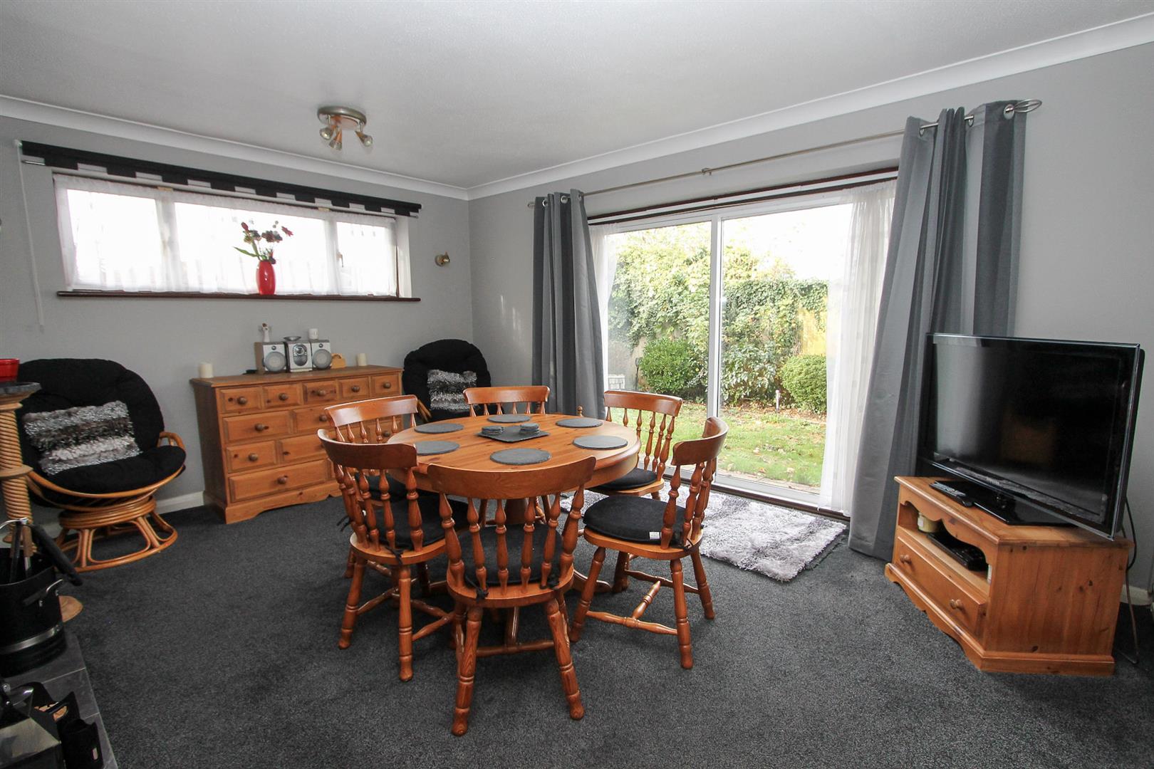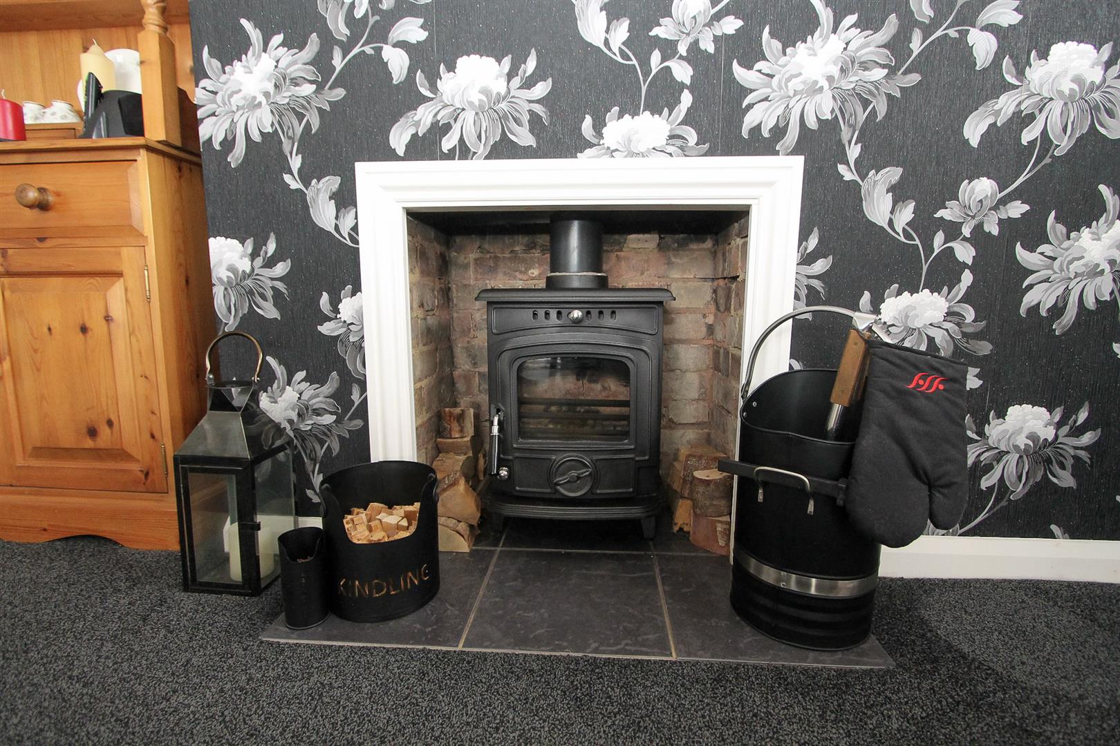 Log burner with tiled hearth, radiator, fitted carpet, double glazed sliding patio doors leading out to garden, double glazed window to side aspect