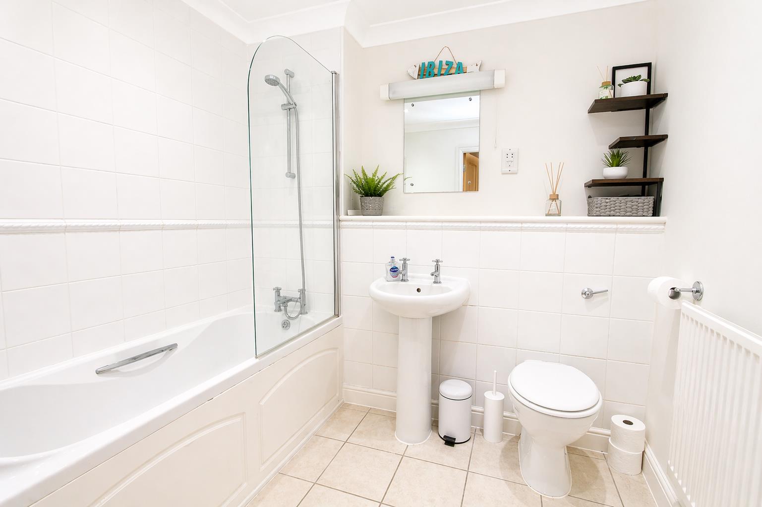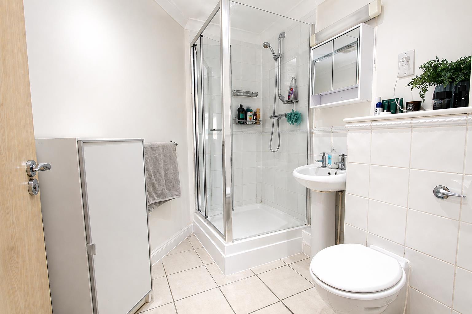 Tiled shower cubicle with thermostatic shower, WC, pedestal wash hand basin with chrome taps, shaver point, radiator, tiled flooring.