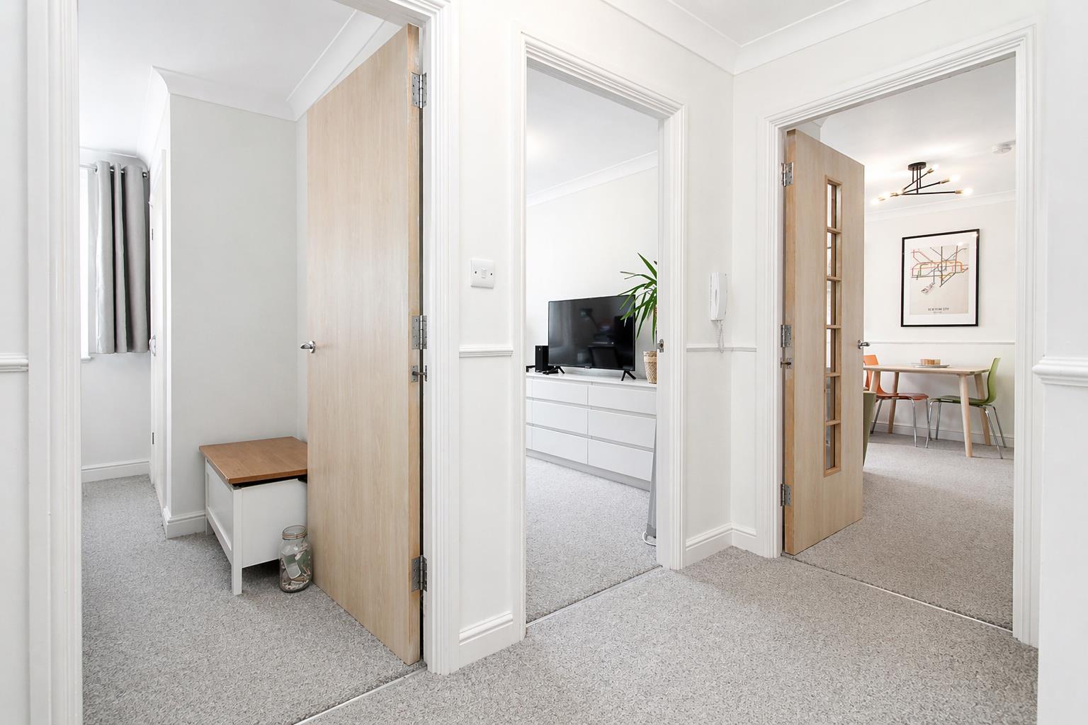 Gated entrance with security phone entry, door into communal hallway with lift and stairs to all floors and property entrance on 2nd floor.
