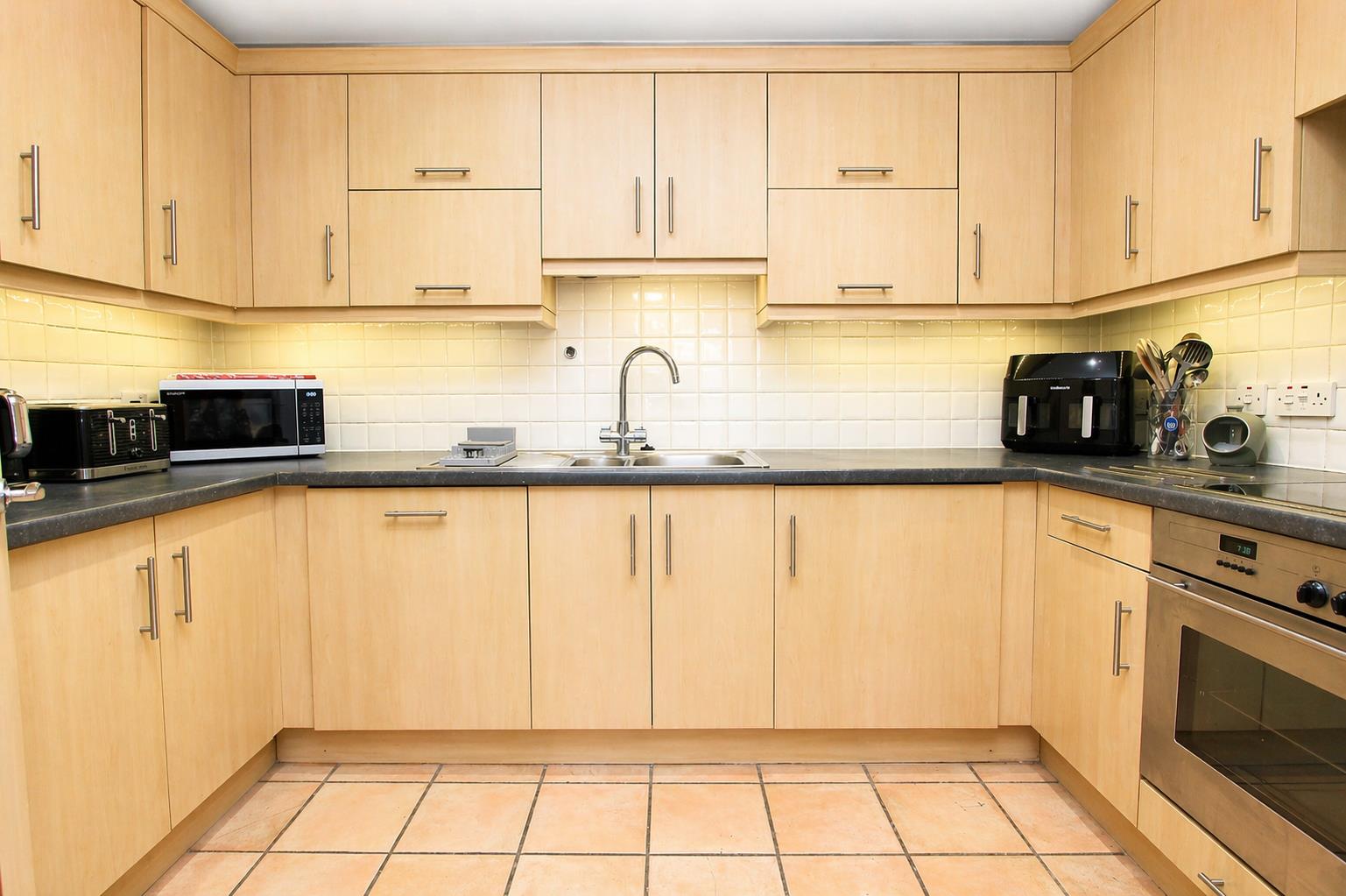 Range of fitted kitchen cupboards and drawers, laminate worktop, inset one and a half bowl stainless steel sink with chrome mixer tap, integrated oven, electric hob and extractor fan above, integrated fridge freezer, dishwasher and washing machine, tiled splashback, extractor fan, tiled flooring.