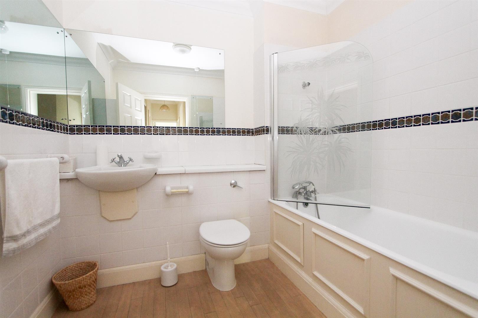 Three piece suite comprising of panel enclosed bath with shower screen, Victorian style chrome mixer tap with showerhead attachment, wash hand basin with Victorian style chrome mixer tap, enclosed WC, radiator, tiled walls, Amtico flooring.