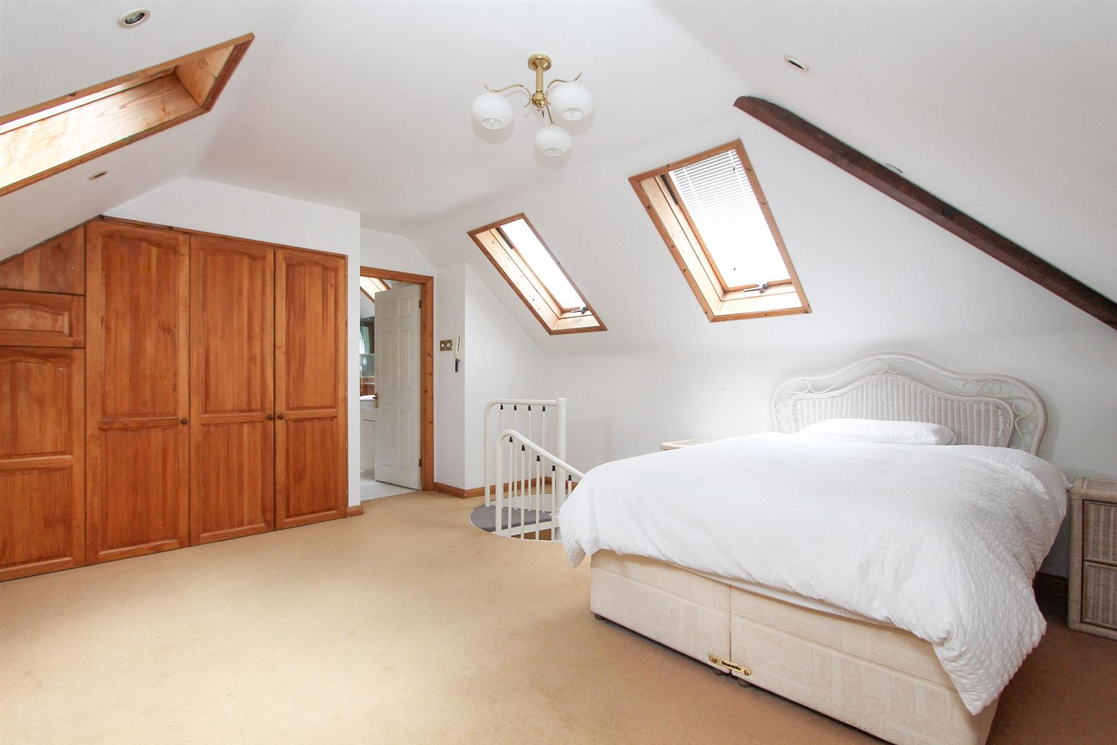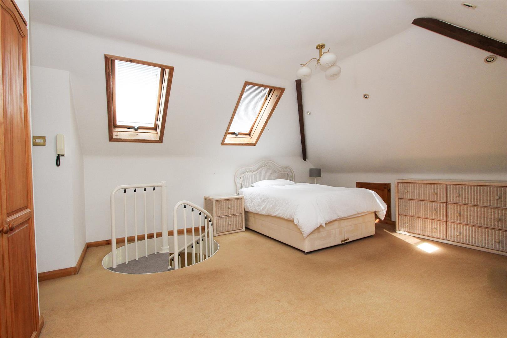Electric heater, fitted carpet, Velux windows to front and rear aspect, eaves storage cupboard, range of fitted wardrobes, security phone entry system, door to...