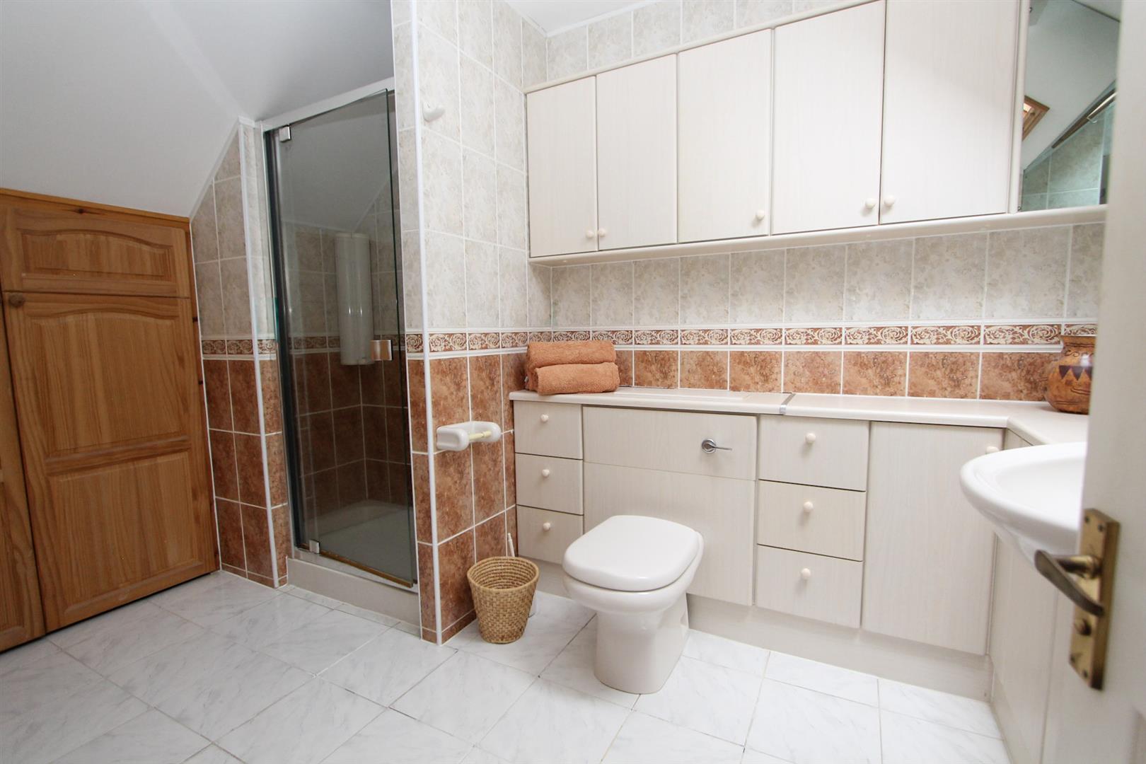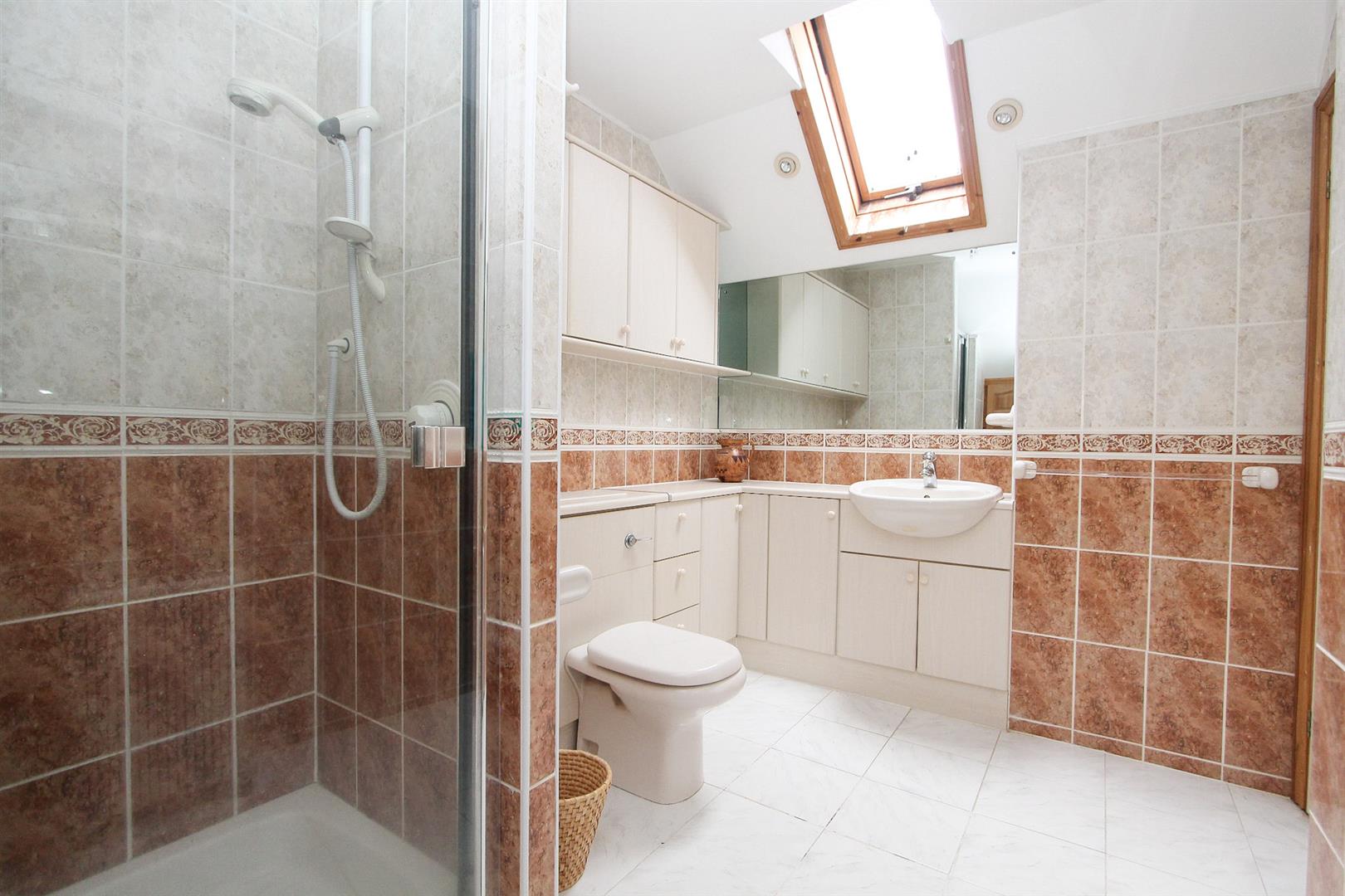 Tiled shower cubicle with Aqualisa shower, enclosed WC, vanity wash hand basin with mixer tap, built-in storage, large storage cupboard, tiled walls, tiled flooring, Velux window.