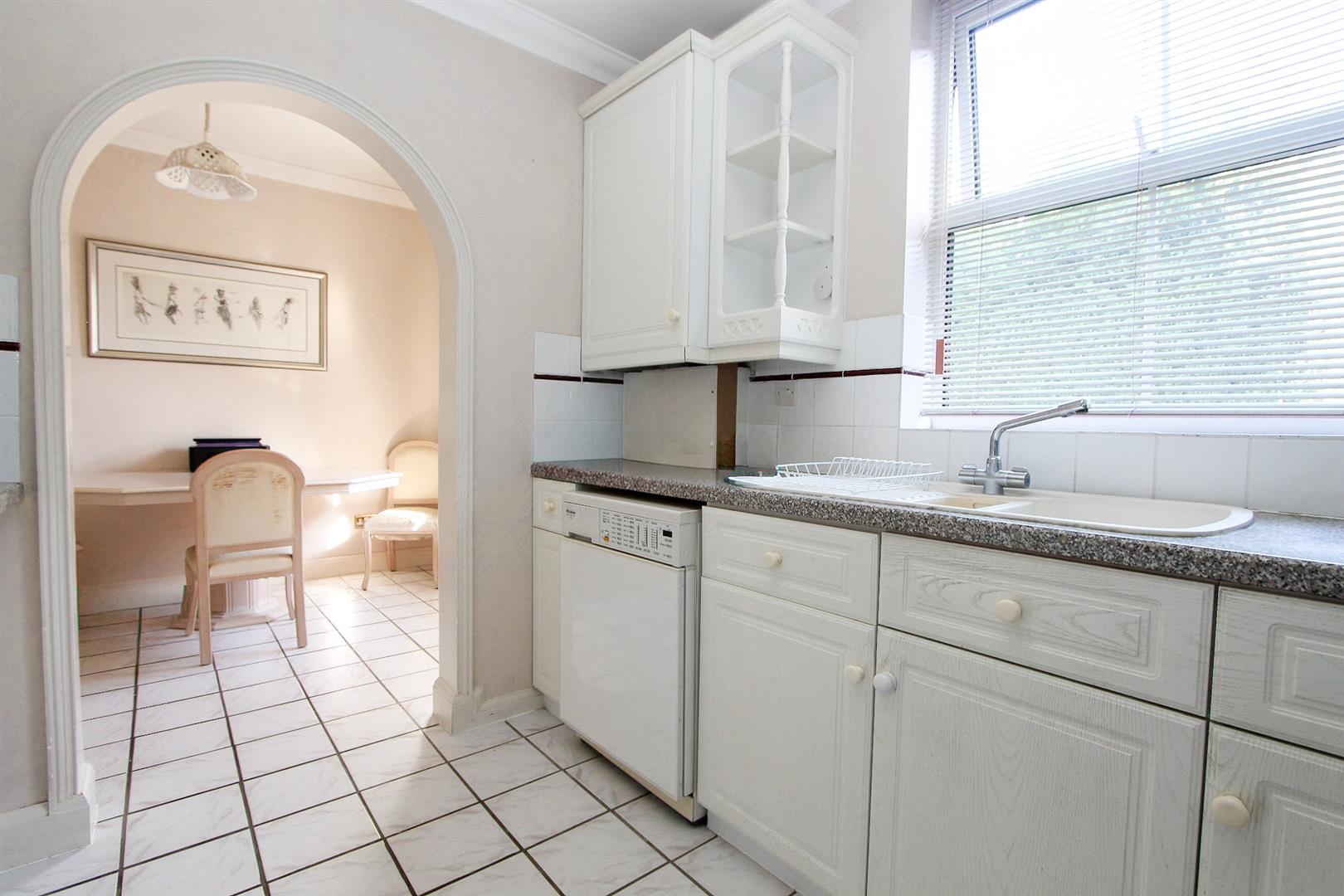 Range of fitted kitchen units and drawers, laminate worktop, inset one and a half bowl sink with chrome mixer tap, integrated oven and electric hob with extractor fan above, integrated under counter fridge freezer and space for washing machine, cupboard housing boiler, radiator, tiled splashback, tiled flooring, double glazed window to side aspect.