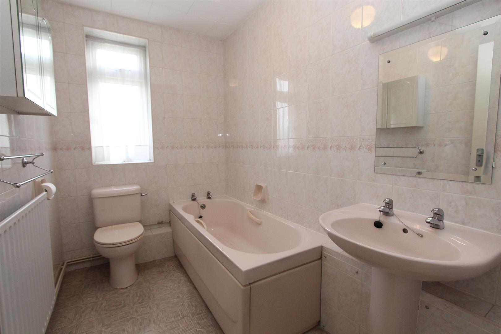 Panel enclosed bath with chrome taps, WC, pedestal wash hand basin with chrome taps, radiator, tiled walls, shaver point, vinyl flooring, double glazed obscure window to front aspect.