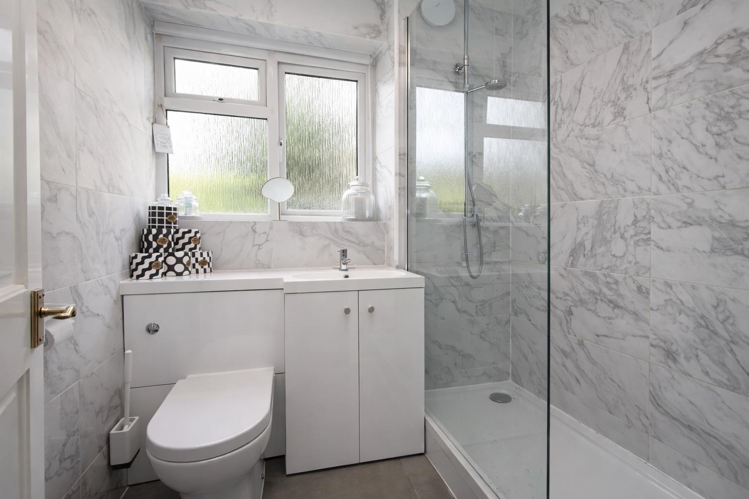 Modern suite comprising of large walk-in shower cubicle, thermostatic shower with rain showerhead and hand shower attachment, vanity wash hand basin with chrome mixer tap and storage below below, enclosed WC, tiled walls, tiled flooring, double glazed obscure window to rear aspect .
