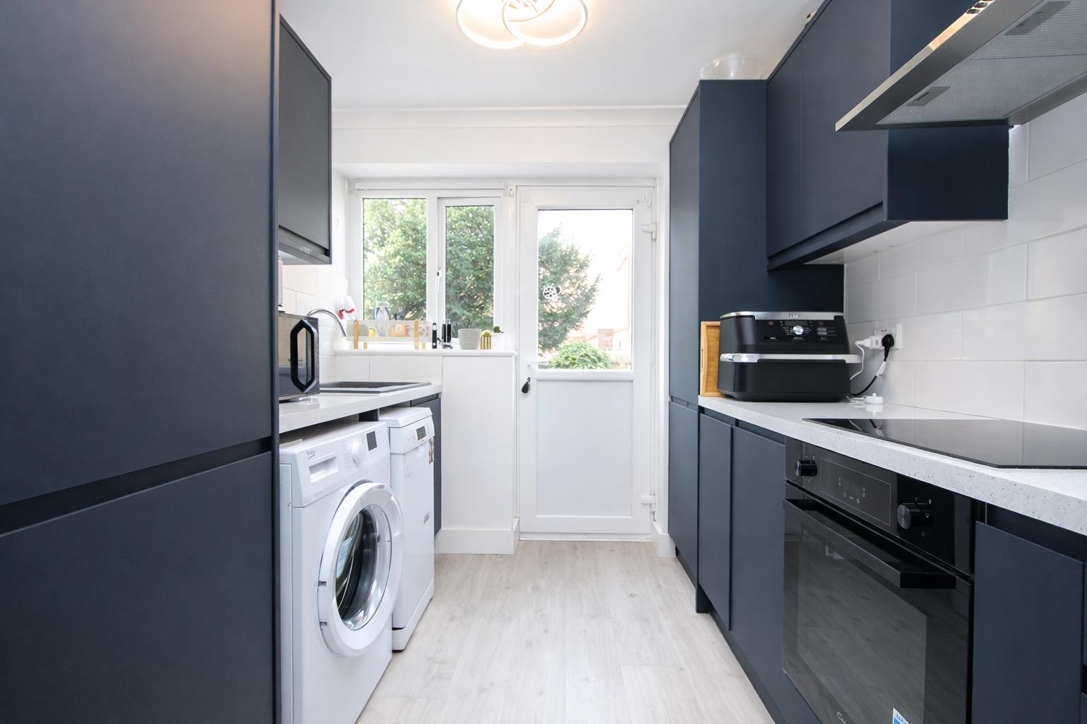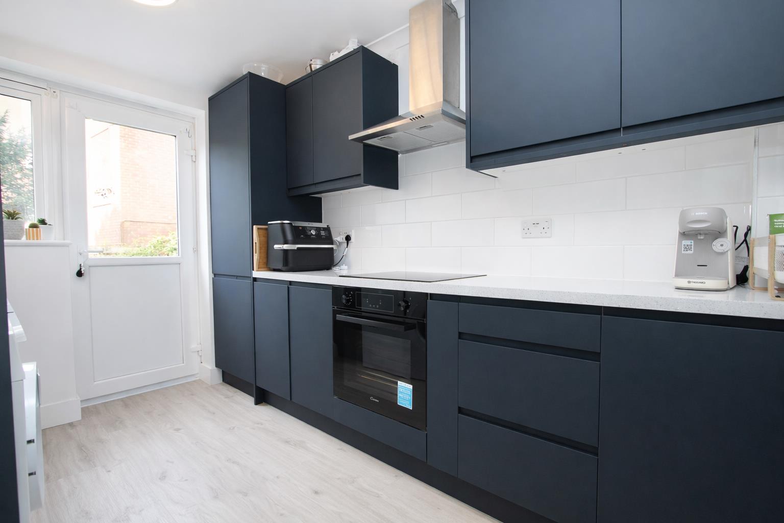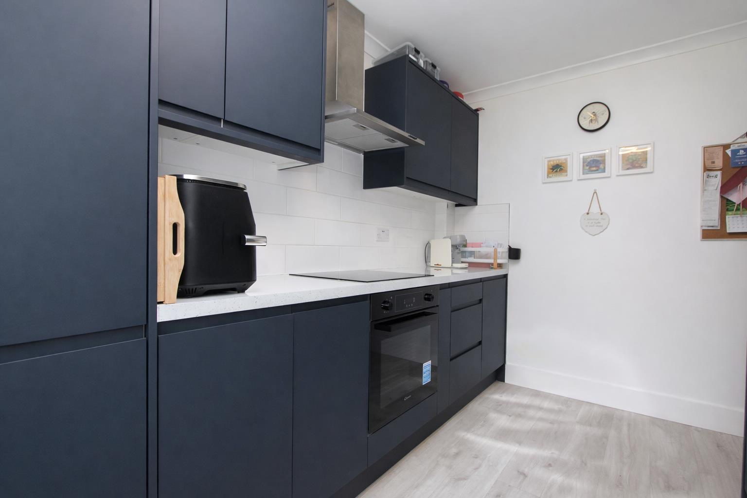 Range of modern navy fitted kitchen units and drawers, laminate worktop, inset composite sink with chrome mixer tap, integrated oven, electric hob and chrome extractor hood above, integrated fridge freezer, space and plumbing for washing machine and dishwasher, tiled splashback, laminate flooring, double glazed window and patio door providing direct access to rear communal garden.