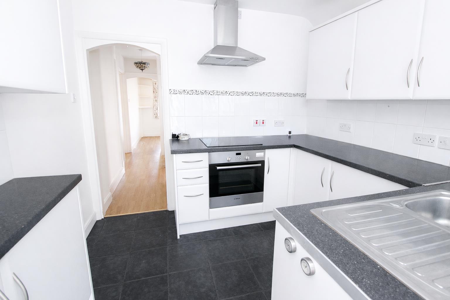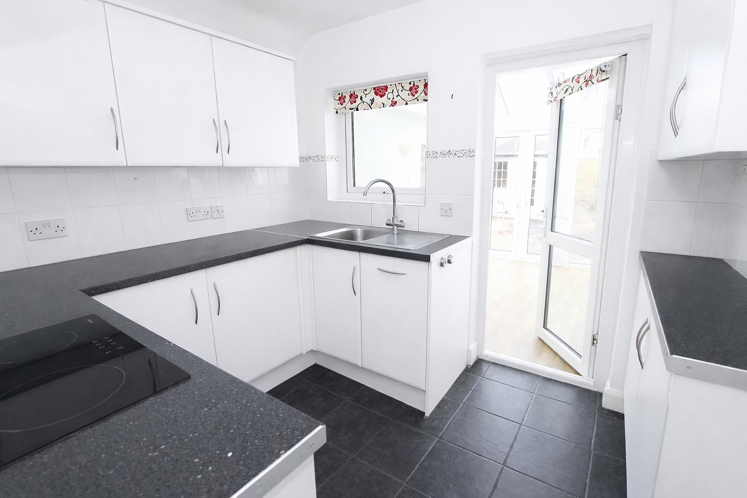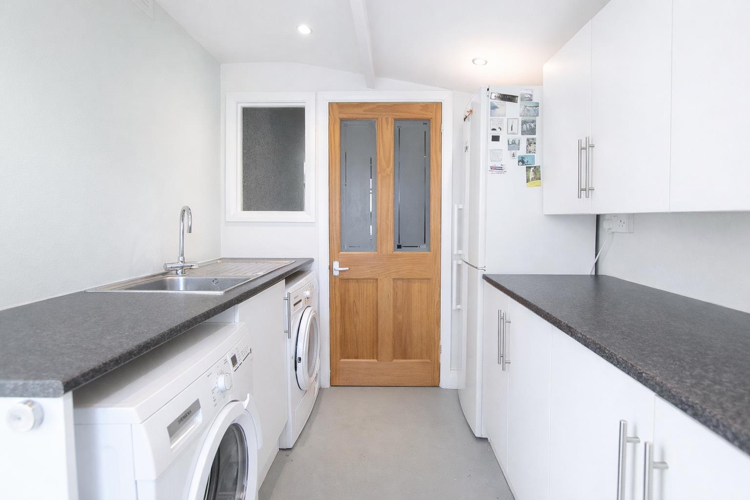 Range fitted wall units with matching cupboards and drawers below, granite effect roll top work surfaces with inlaid stainless steel sink and chrome mixer tap, space and plumbing for washing machine and tumble dryer, space for tall standing fridge/freezer, access to garden and garage.